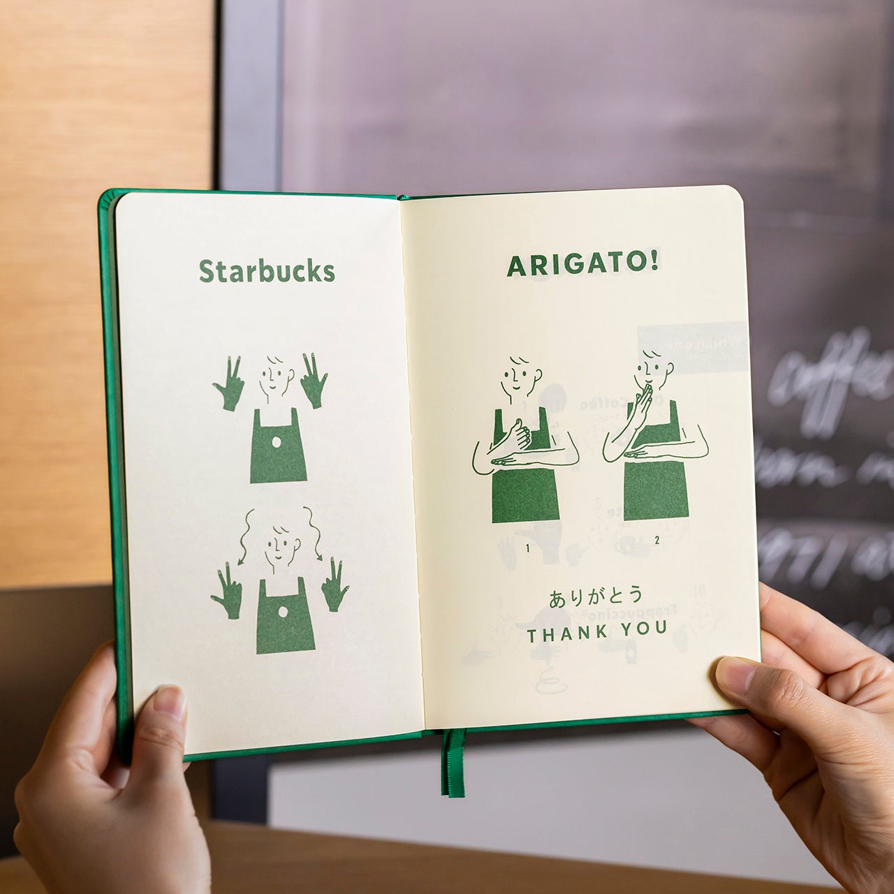 ジャーナルブックはグリーンのハードカバーで、使いやすいA5サイズ程度。ページをめくると、簡単な挨拶や数ページをめくると、簡単な挨拶や数字、ビバレッジの注文時に役立つ表現など、日常生活で使える手話のフレーズが、イラストで紹介されています。「手話を使った会話を楽しみ、コミュニケーションの多様性を体験するきっかけになってほしい」というスターバックスの想いが込められています。