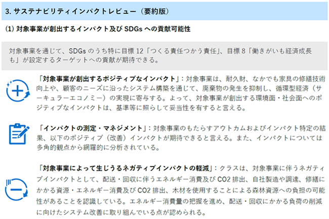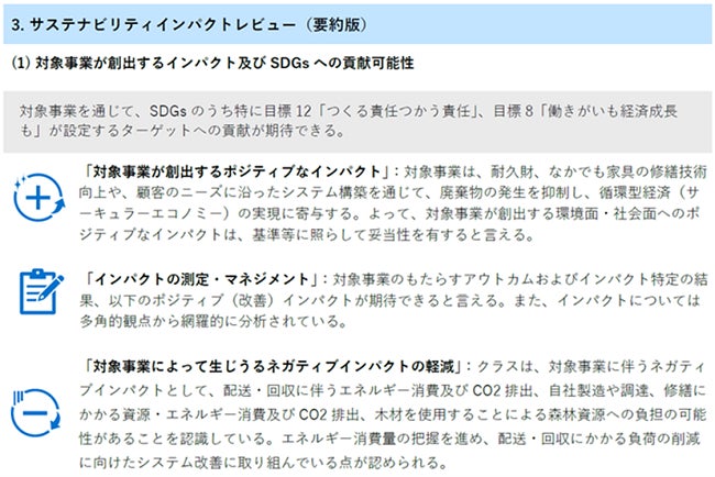 持たない、捨てない社会をつくる株式会社クラス(本社:東京都目黒区、代表取締役社長:久保 裕丈、以下「当社」)は、株式会社日本総合研究所(本社:東京都品川区、代表取締役社長:谷崎 勝教、以下「日本総研」)がサステナブルファイナンスに関する日本総研の調査・研究実績に基づいて開発した、インパクト指標の設定メソッド「サステナビリティインパクトレビュー」(Sustainability Impact Review)の第1号案件として、第三者機関による外部評価を実施いたしました。