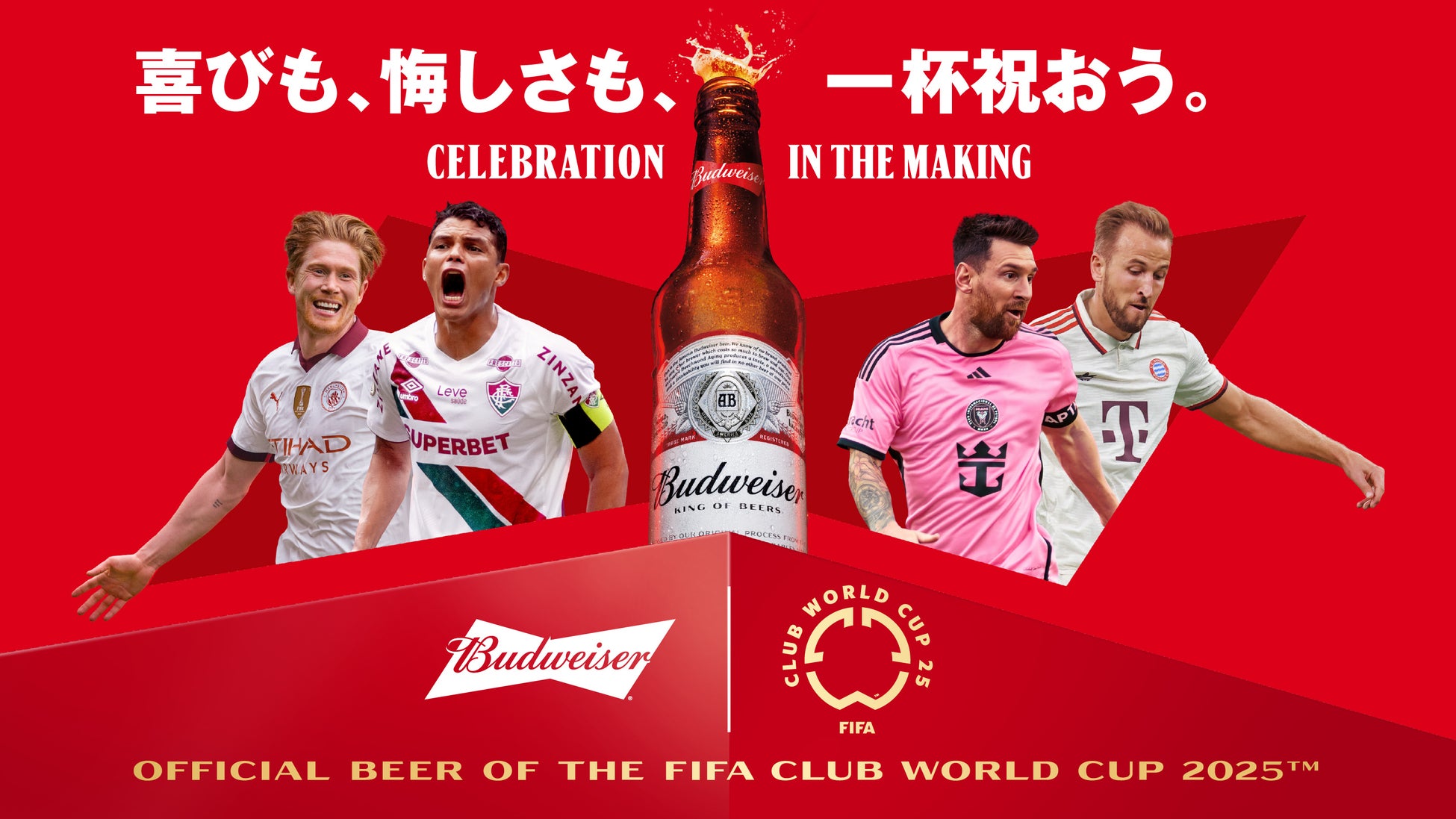 今回の公式キービジュアルには、現インテル・マイアミCF所属でアルゼンチン代表のリオネル・メッシ選手をはじめとした有名選手を起用。「Celebration in the making(喜びも、悔しさも、一杯祝おう)」というコピーで、試合の感動や悔しさ、余韻に寄り添う乾杯の瞬間を表現しています。このコピーには、目の前の試合も、電車に乗って帰った後も、その気持ちにいっぱい寄り添う乾杯を、一杯。という想いが込められています。バドワイザーは、FIFA公式ビールパートナーとしてすべての試合を盛り上げる体験をこれからも提供していきます。