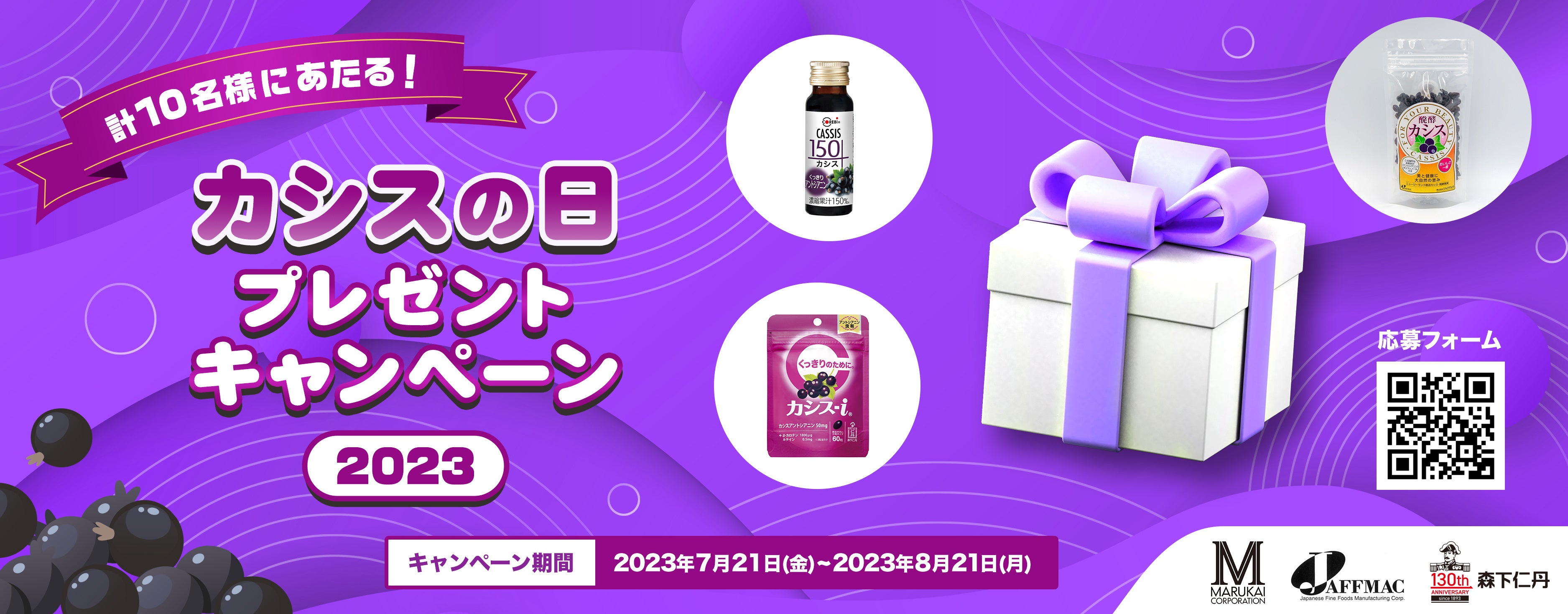 キャンペーンでは、応募フォームよりお申込みいただいた方の中から抽選で、カシス関連商品「カシス150」(ジュース)や「醗酵カシス」(発酵セミドライフルーツ)、「カシス-i®」(サプリメント)を詰め合わせた「カシス詰め合わせセット」を10名様にプレゼントします。