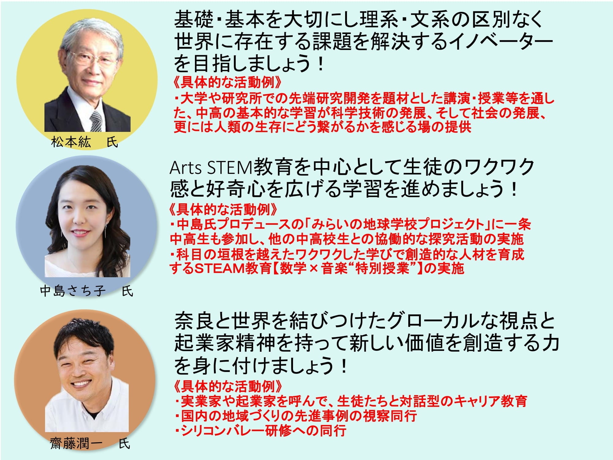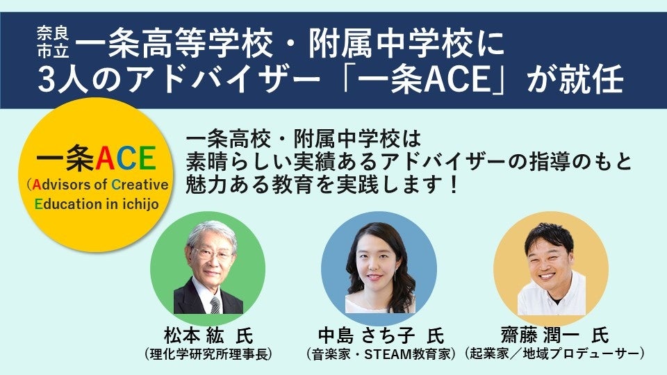 先行きが不透明な予測困難な時代に、奈良市立一条高等学校及び附属中学校(令和4年4月開校)の子どもたちが、世界を体感し活躍できる力を学ぶため、優れた見識や専門的な知識を有する3人に、アドバイザー「一条ACE」として一条が目指す特色ある教育の研究・実践に係る指導及び助言を行っていただきます。