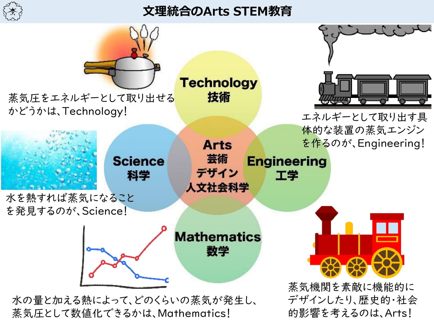 普遍的な論理的思考や基盤となる学⼒(Liberal Arts)を養い、Arts(⽂系)の「発散思考」から STEM(Science、Technology、Engineering、Mathematics)の「収束思考」に跨がる、⽂理統合型の「考える⼒」を獲得する学びのこと。