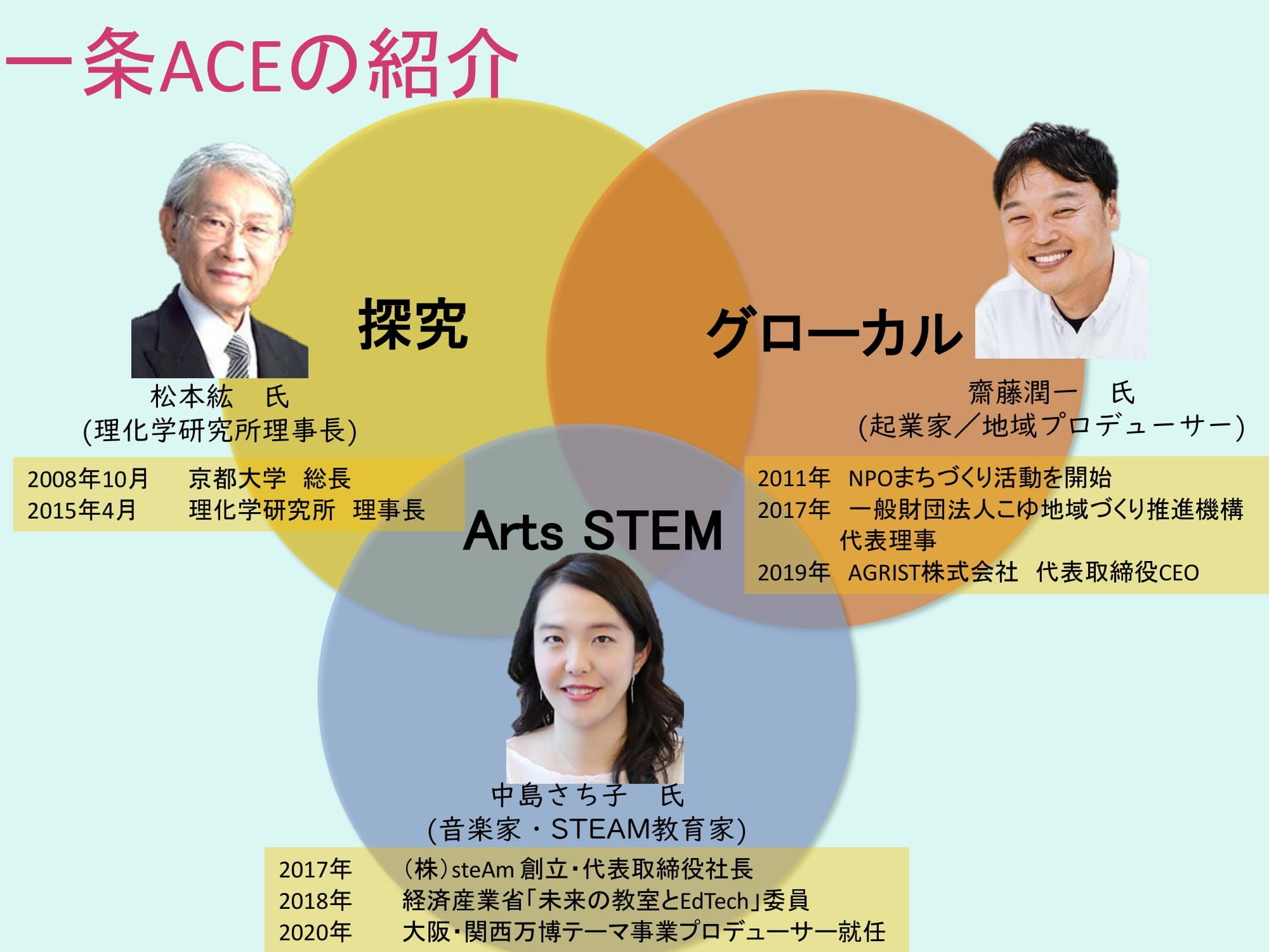 日本や世界をとりまく状況は、先行きが不透明な予測困難な時代であり、そのような社会を生きていく子どもたちには、自ら目標をみつけ、努力し他の人を変えていくリーダーシップと、自由に生きることができる「個人」の育成が求められています。一条高等学校及び附属中学校の子どもたちが、世界を体感し活躍できる力を学ぶため、優れた見識や専門的な知識を有する3人の方に「一条ACE(エース)」(※2)として就任していただき、一条が目指色ある教育の研究・実践に係る指導及び助言を行っていただきます。