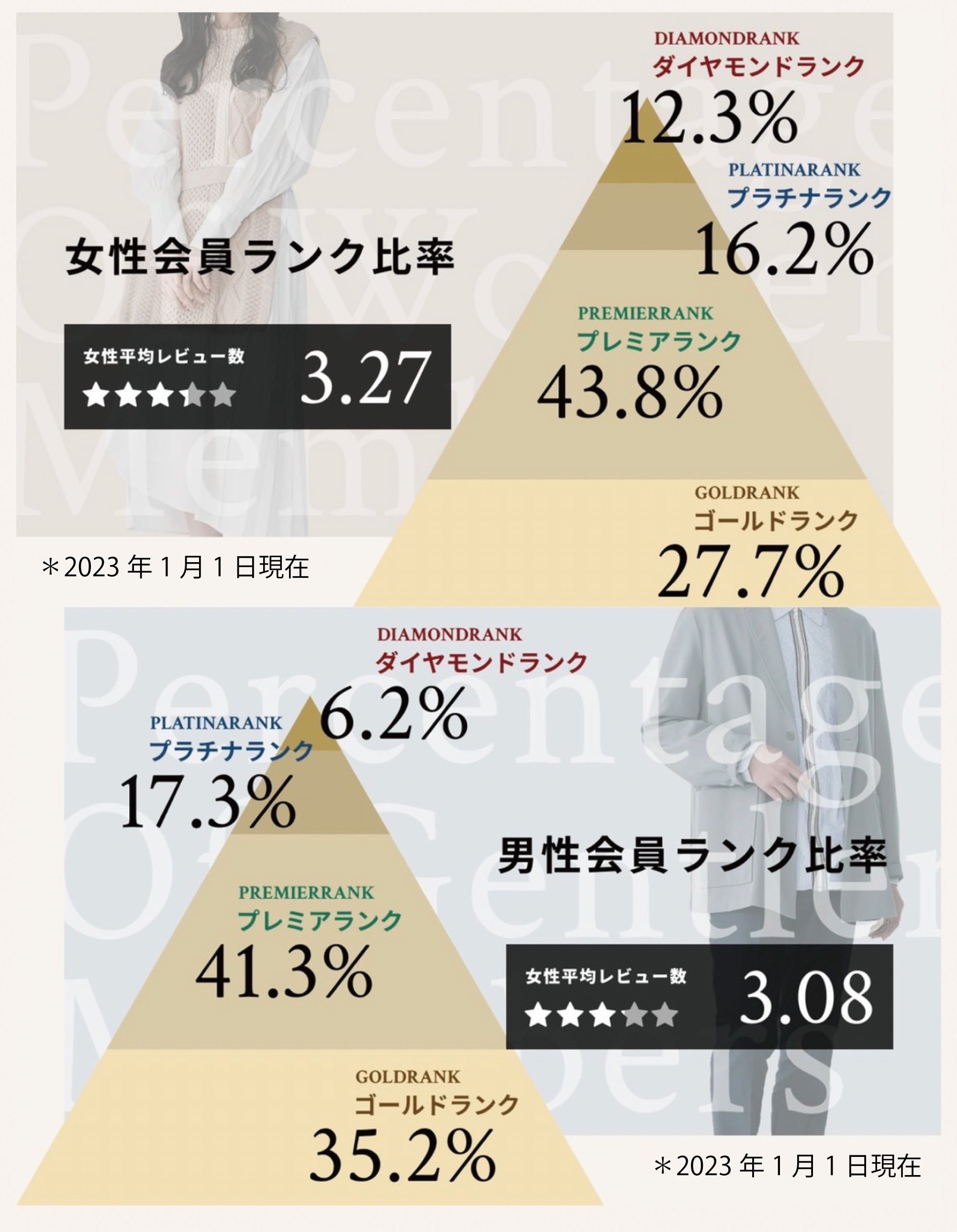 PREMIA会員は「相席回数4回以上かつ個人評価3.5以上」、PLATINA会員は「相席回10回以上かつ個人評価3.7以上」、DIAMOND会員は「相席回30回以上かつ個人評価4.0以上」が条件となっており、ランクが上がると質の高いランク別イベントのご招待や、優先入場、入店前に店舗入口にて店内の「年齢/男女比率」がご確認いただける店内状況の事前確認(女性のみ)などさまざまな特典を受けることができます。今後もさらにお客様に喜んでもらえるような特典や企画を実施予定です。