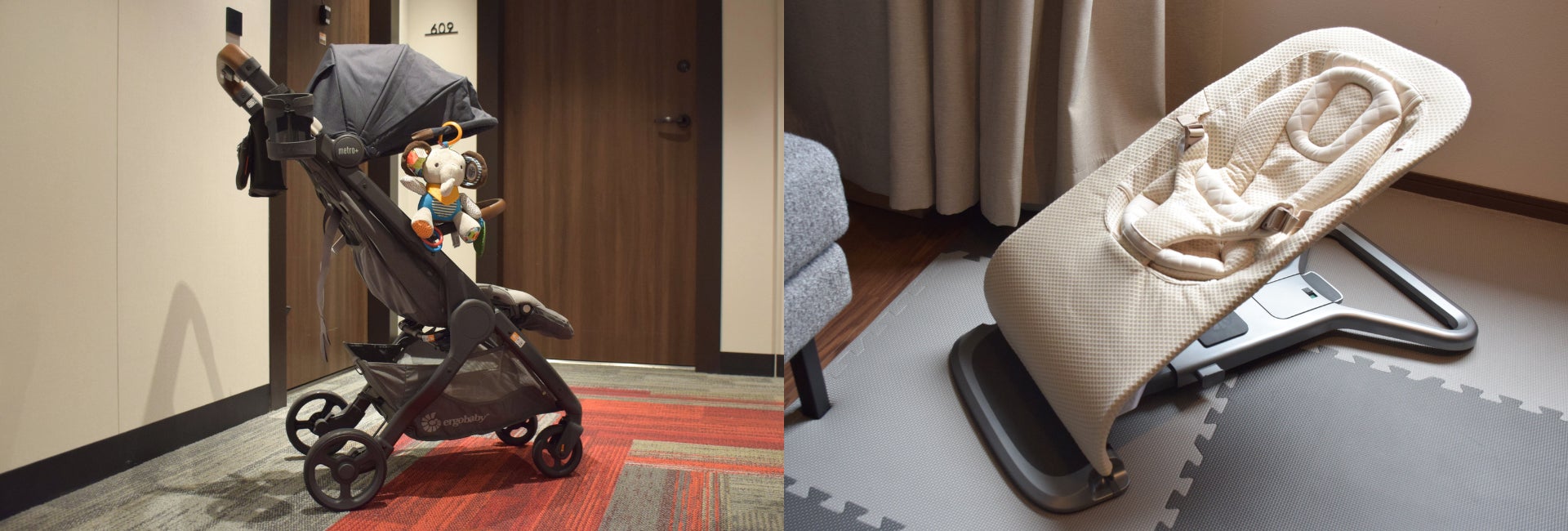 滞在中に親子が快適に過ごせることはもちろん、1歳ごろからの環境も体験できるように、選りすぐりの育児用品やおもちゃをセレクト。産後間もないママと赤ちゃんはもちろん、お兄ちゃんお姉ちゃんにもホテルステイを楽しんでいただけます。