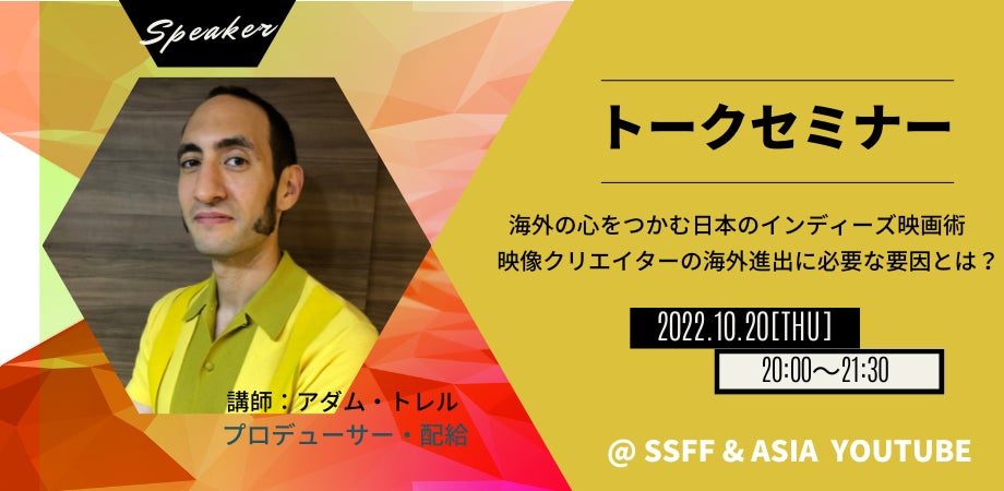 アダム・トレル氏を迎え、海外で共感を呼ぶ、話題となる日本映画作品の傾向分析や秘訣、数多くの日本映画を海外に配給してきた同氏の視点による、「日本映画・業界」についてもトーク頂きます。若手映像クリエイターにとっても必見セミナー。