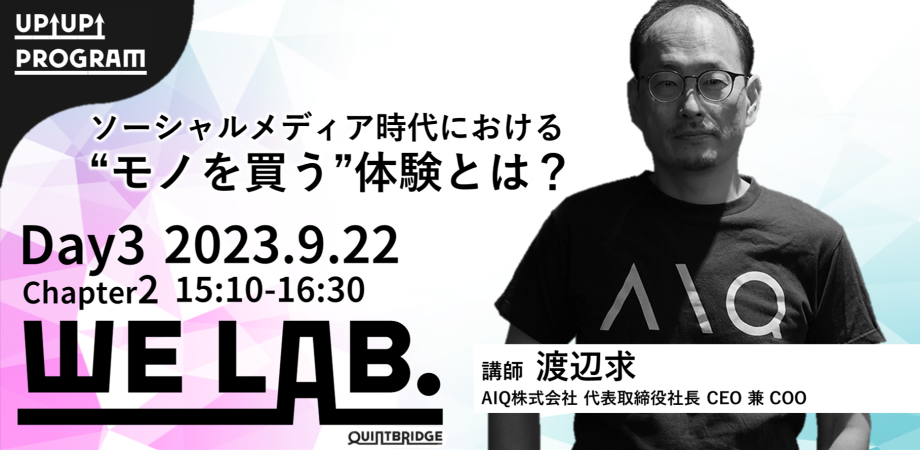 "私の「本当の好き」が、あなたの「価値」に変わる社会"を目指すAIQ(アイキュー)株式会社(本社:東京都文京区、代表取締役社長CEO兼COO 渡辺求)は、西日本電信電話株式会社(本社:大阪府大阪市都島区、代表取締役社長 社長執行役員:森林 正彰、以下、NTT西日本)が運用するオープンイノベーション施設「QUINTBRIDGE(クイントブリッジ)」にて、9月22日に開催される「学ぶプログラムWe Lab.」に代表の渡辺が登壇することをお知らせいたします。