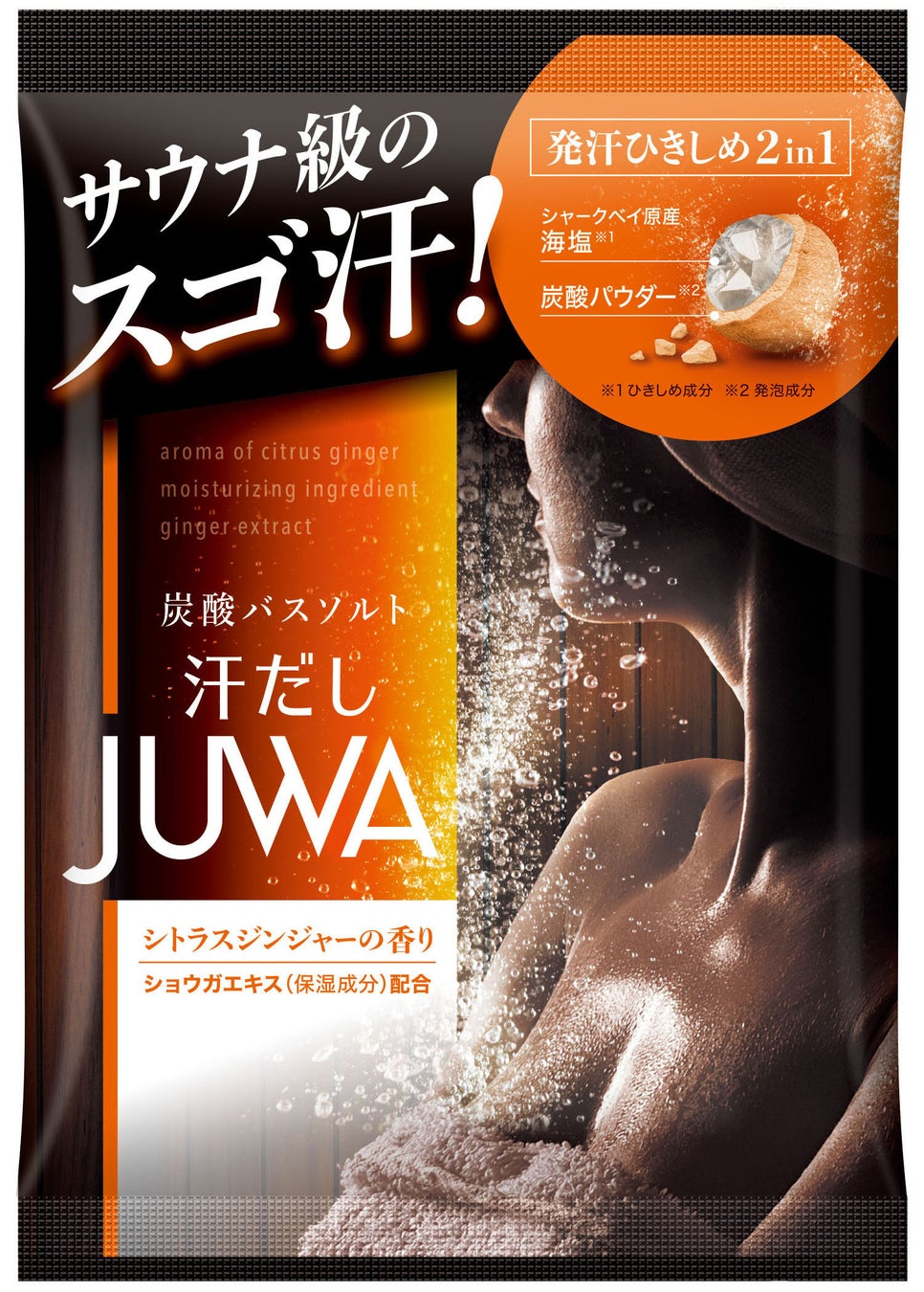 『汗だしJUWA』は、バスソルトでありながら発泡する様子も楽しめる新感覚バスソルトです。世界遺産オーストラリア シャークベイ原産の海塩*1をじゅわっと弾ける炭酸パウダー*2でコーティングし、その炭酸パウダーが発泡したあと、内側の海塩が溶けだす2段階処方となっており、サウナのようにじゅわっと汗だし、気分がスッキリととのいます。さらに、スパイシーウッドの香りにはトウガラシエキス*3、シトラスジンジャーの香りにはショウガエキス*3を配合しています。*1:ひきしめ成分 *2:発泡成分 *3:保湿成分