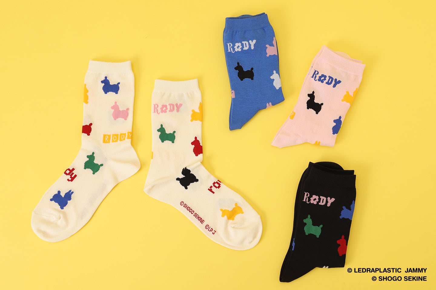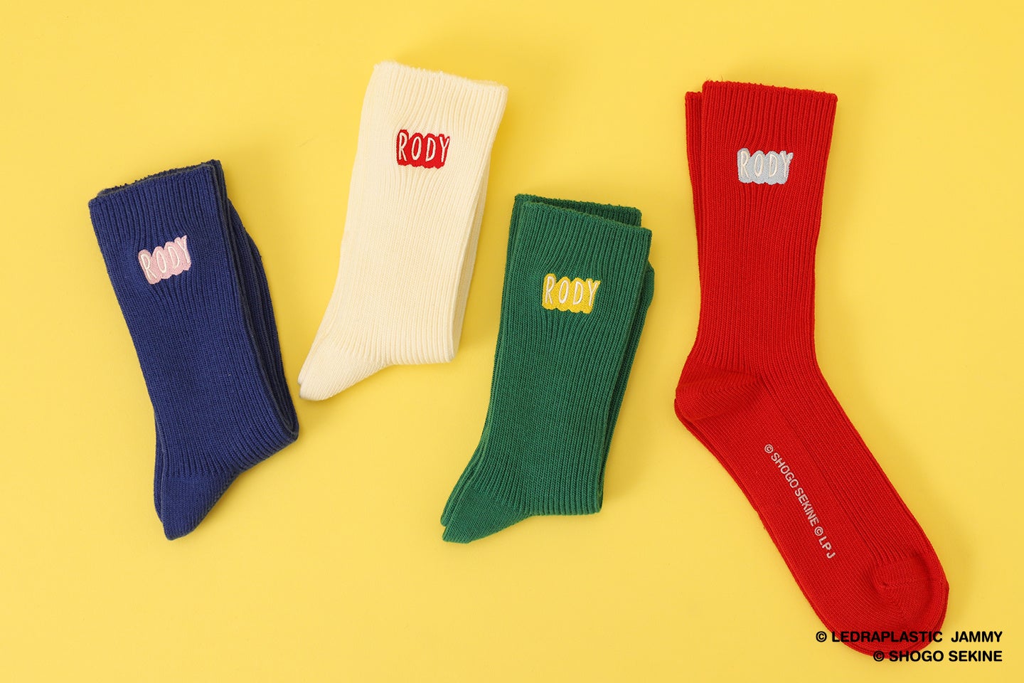 今回展開するのは、イラストレーターのSHOGO SEKINEデザインのRODYをモチーフにした靴下。履くだけでワクワクするような、カラフルでポップなデザインの4型です。