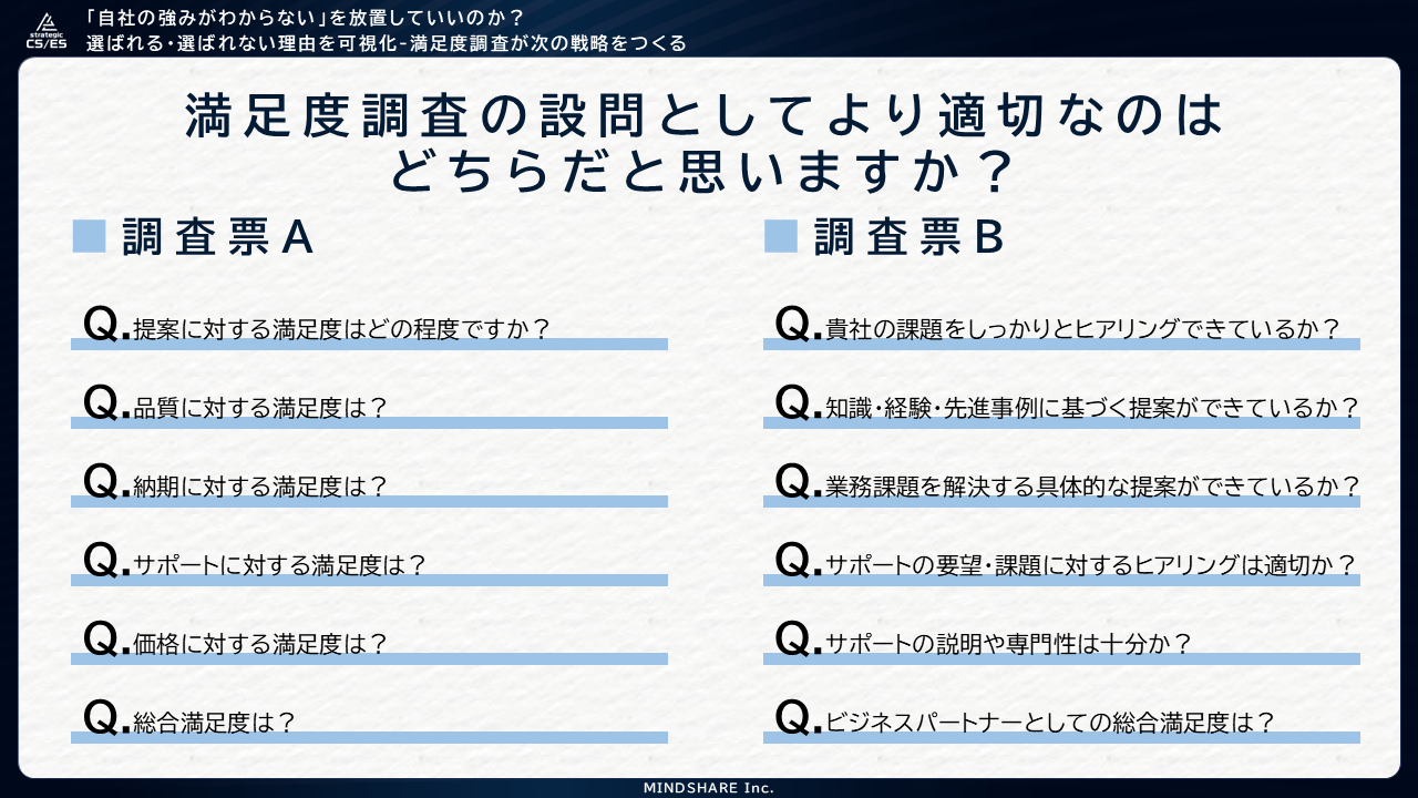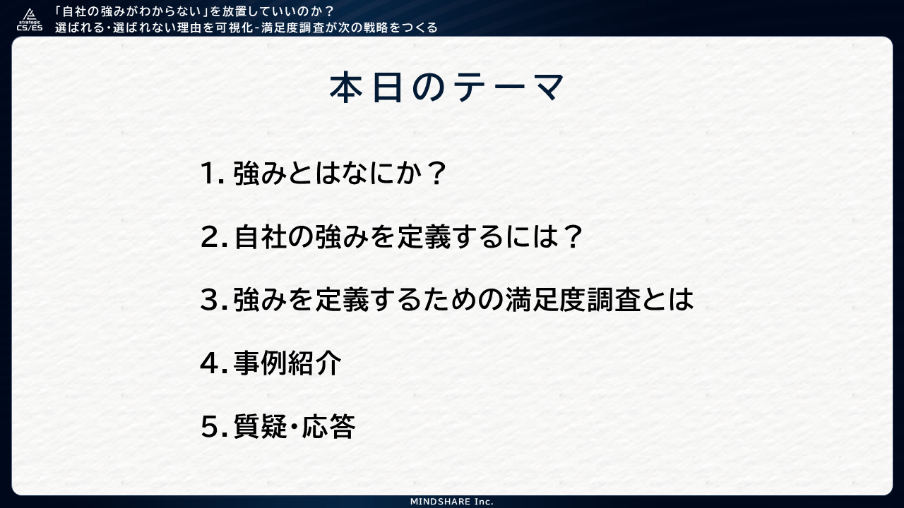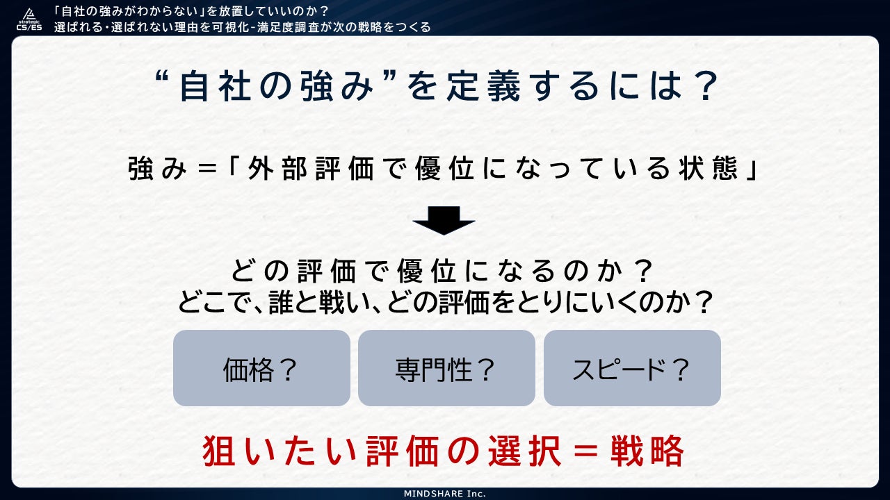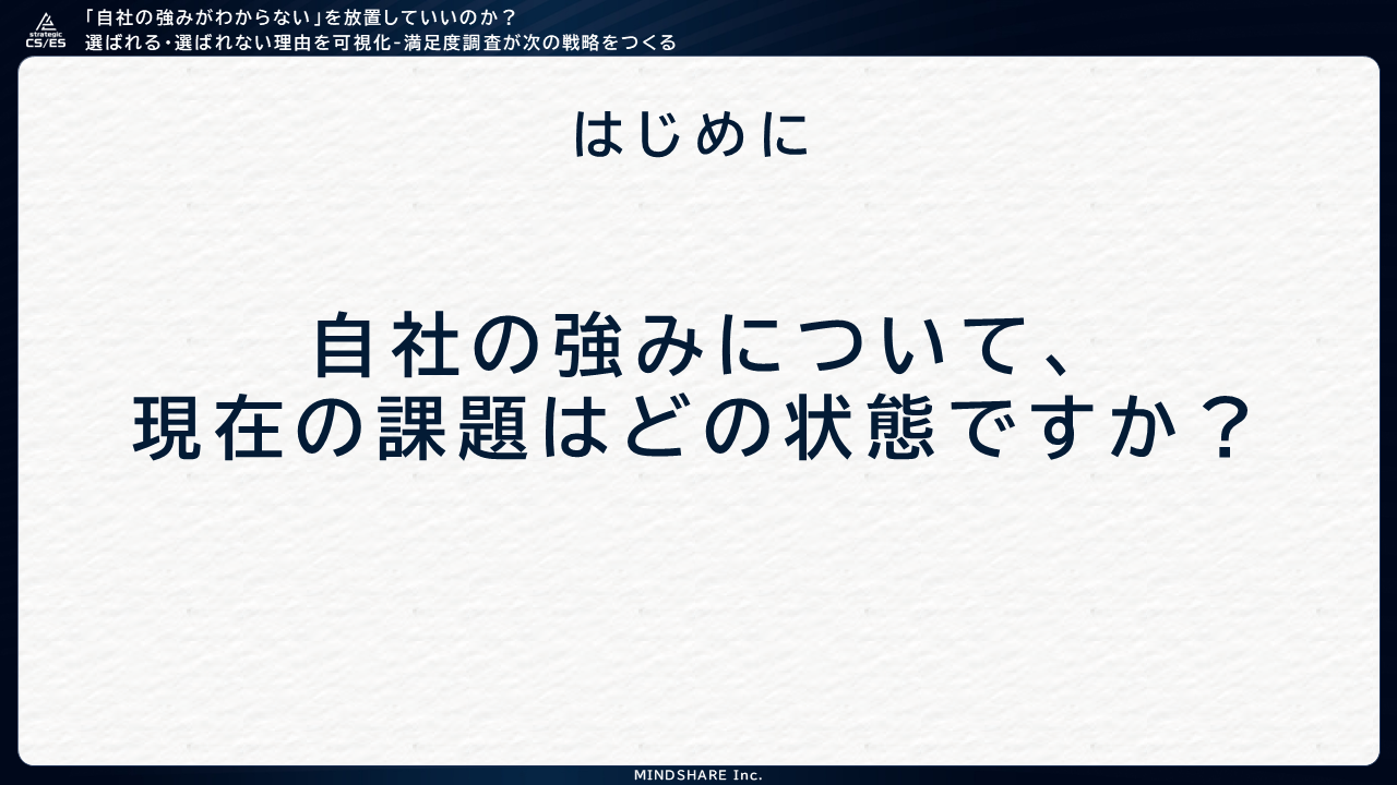 株式会社マインドシェア(本社:東京都港区)は、BtoB企業向けオンラインセミナー「『自社の強みがわからない』を放置していいのか? “選ばれる・選ばれない”理由を可視化―満足度調査が次の戦略をつくる」を開催いたしました。