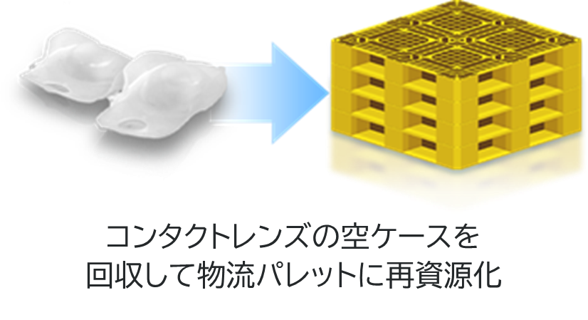 本活動にご賛同いただいている眼科やコンタクトレンズ販売店等に回収ボックスを設置し、メーカー問わず使い捨てコンタクトレンズのブリスターを回収。収集されたブリスターはリサイクル事業者により再資源化され、物流パレットとして製品化されます。収益は、海洋ごみ問題解決に向けて活動している一般社団法人JEANに全額寄付しています。