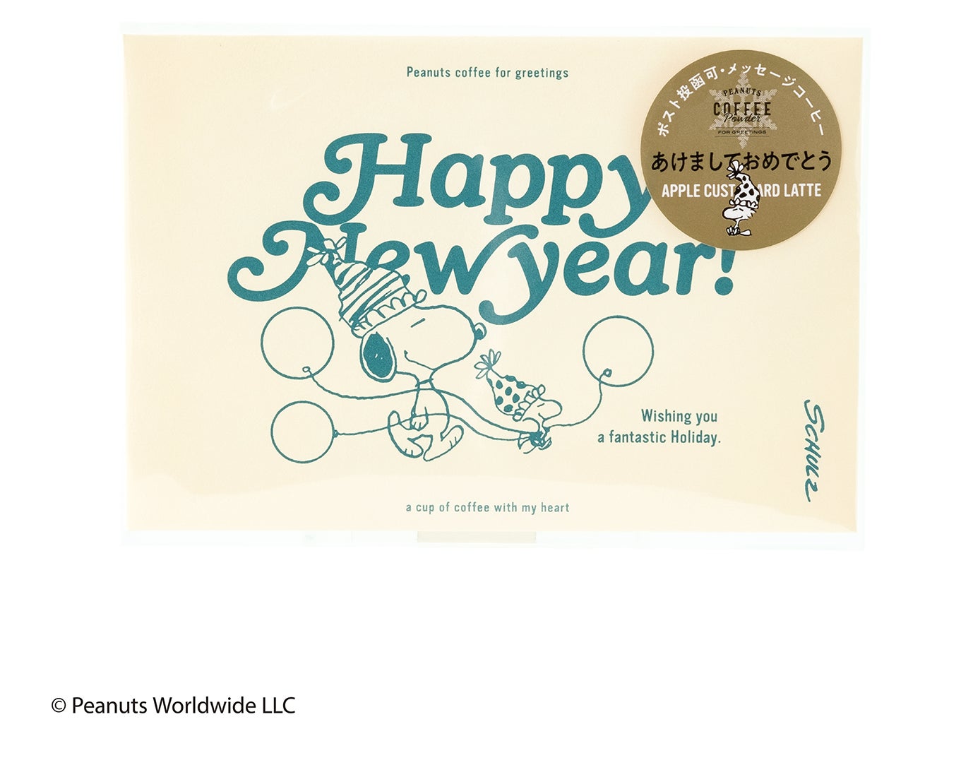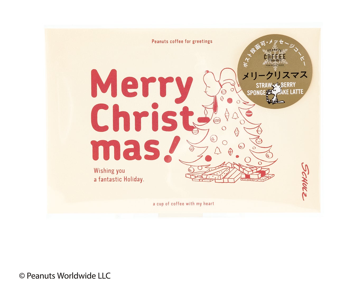『Merry Christmas!(メリークリスマス!)』『Happy New year!(ハッピーニューイヤー!)』のメッセージとピーナッツのキャラクターが描かれた封筒の中に、1杯分のカフェラテ専用パウダーと1枚のコースターが入っています。宛名を書いて切手を貼れば、ポスト投函も可能なギフトです。