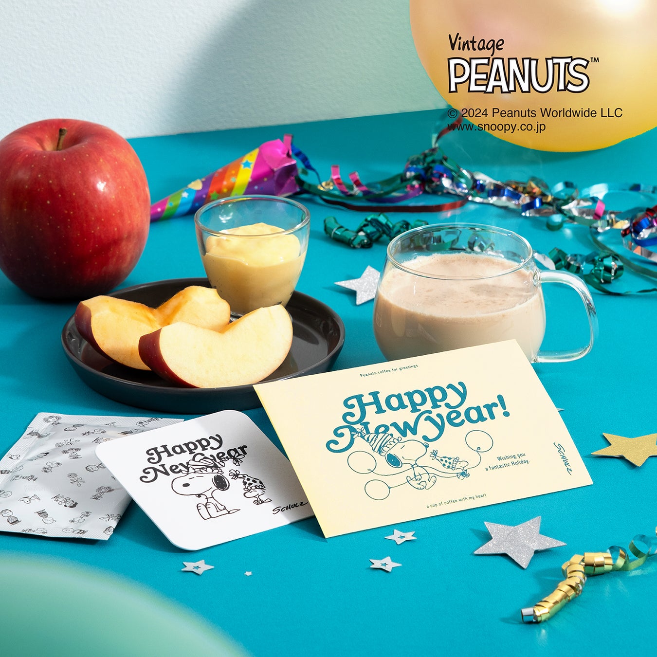 新年を待ちわびるうきうきなスヌーピーとウッドストックのイラストは、受け取った瞬間に楽しい気持ちを引き立ててくれます。新年のご挨拶にぴったりな限定デザインです。
