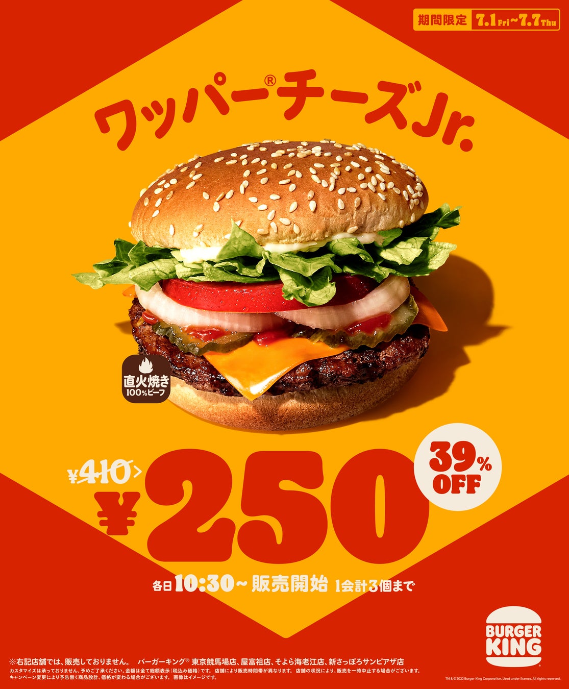 株式会社ビーケージャパンホールディングス(本社:東京都千代田区)は、2022年7月1日(金)~7月7日(木)の1週間限定で、各日10時30分から『ワッパー® チーズJr.』を通常価格410円のところ、今できる最大値引きの国民割・約39%オフの250円で販売いたします。