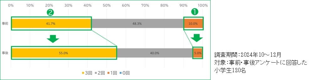 その結果、歯みがき回数が1日1回だった子どもが10.0%→5.0%へ減少し(①)、3回歯みがきをする子どもが41.7%→55.0%に増加(②)しました(図)。その中でも、朝歯みがきを実践した子どもは84.2%→93.3%に増え、夜歯みがきは96.7%→99.2%と高い実践率でした。これらより、体験プログラムに参加した子どもの1日の歯みがき回数が一ヵ月後に増えたことを確認できました。