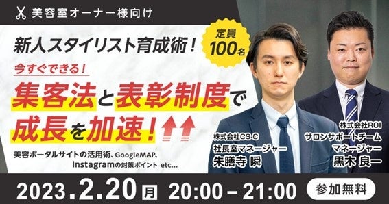 そこで今回は「新人スタイリスト育成術!今すぐできる集客法と表彰制度で成長を加速!」というテーマで、ローカルビジネスDX事業を展開する株式会社CS-Cと、ファンづくりを科学する顧客体験(CX)マネジメントSaaSサービスを運営する株式会社ROIの共催で、美容室の皆様向けにウェビナーを開催いたします。