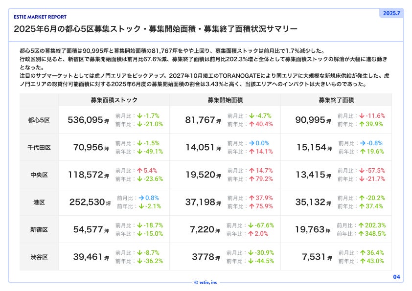 日本最大級の商業用不動産データ分析基盤「estie マーケット調査」を中心に複数のサービスを提供する株式会社estie(本社:東京都港区、代表取締役:平井 瑛、以下「estie」)は、「estie マーケット調査」による分析データをまとめた最新不動産マーケット動向レポート「エスティ マーケットレポート」2025年7月号を配信開始しました。