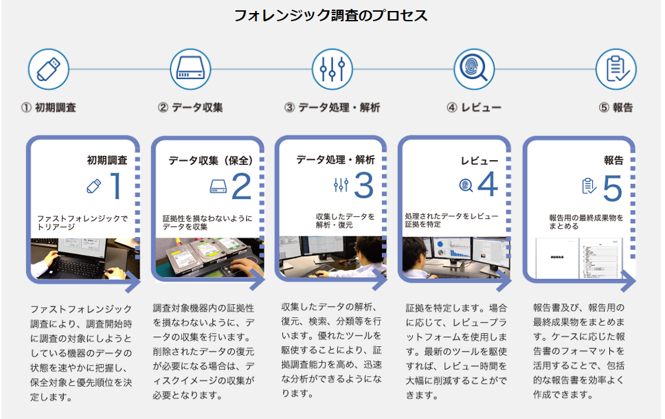 企業が自力で不正調査を行うためのソリューションとして、当社の20年以上のフォレンジック調査のノウハウを結集して、実際のフォレンジックルームの設置からツールの導入、フォレンジック調査のレクチャーまでを全てワンストップでご提供します。