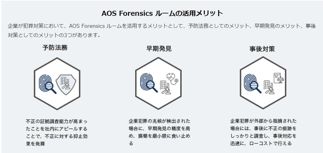 企業が企業犯罪対策において、AOS Forensics ルームを活用するメリットとして、予防法務としてのメリット、早期発見のメリット、事後対策としてのメリットの3つが期待できます。