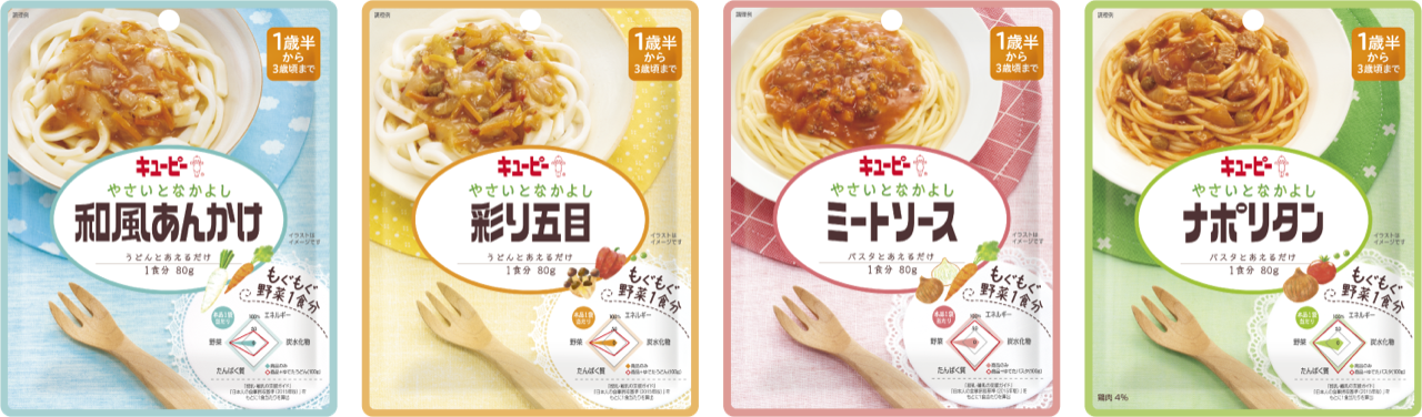 キユーピー幼児食「やさいとなかよし」からゆでたパスタやうどんにあえるだけ。1食分の野菜が摂れる麺用ソース