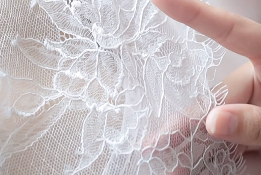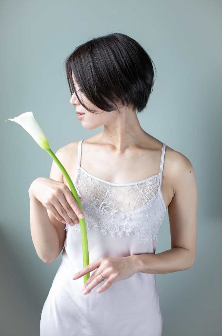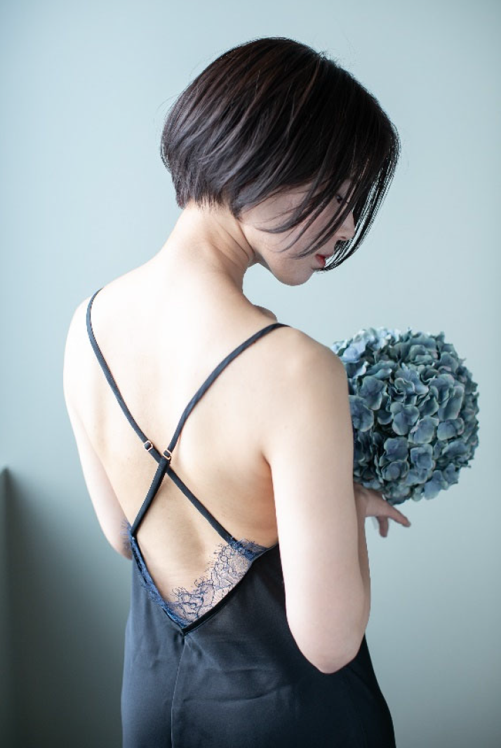 ⽣熊はブライダルの撮影に携わっていた頃から花嫁のベールやドレスのレースを⽬にする度に、レースの透明感や、レースが光に当たって作り出す影の美しさに魅了されてきました。スリップの胸元やバックサイドにあしらったレースは、膨⼤な数のレースのサンプルの中から選りすぐった⼀枚です。繊細なモチーフがあしらわれたレースで胸元を覆うことで、⾒えそうで⾒えない余⽩のある美を表現しました。写真家としてモデルに当たる光の⾓度や影の落ち⽅、背景とのバランスなど細部を意識してきた経験は、スリップのディティールのデザインに⽣かしました。
