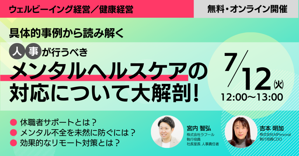 ウェルビーイング経営支援のラフール、「【人事担当者様向け】具体的事例から読み解く人事が行うべきメンタルヘルスケアの対応について大解剖!」をテーマにAll Personal社と共催セミナーを開催!