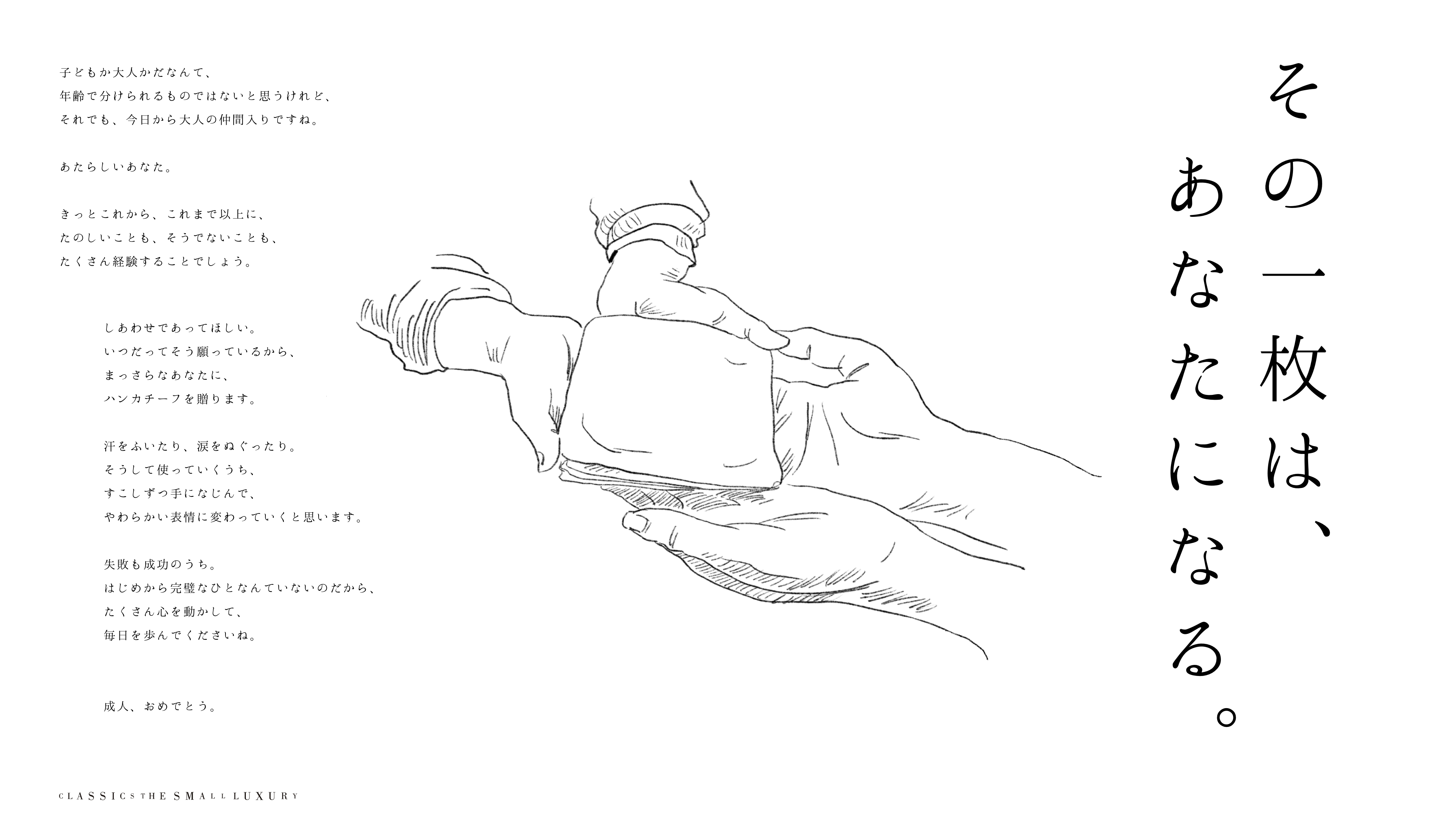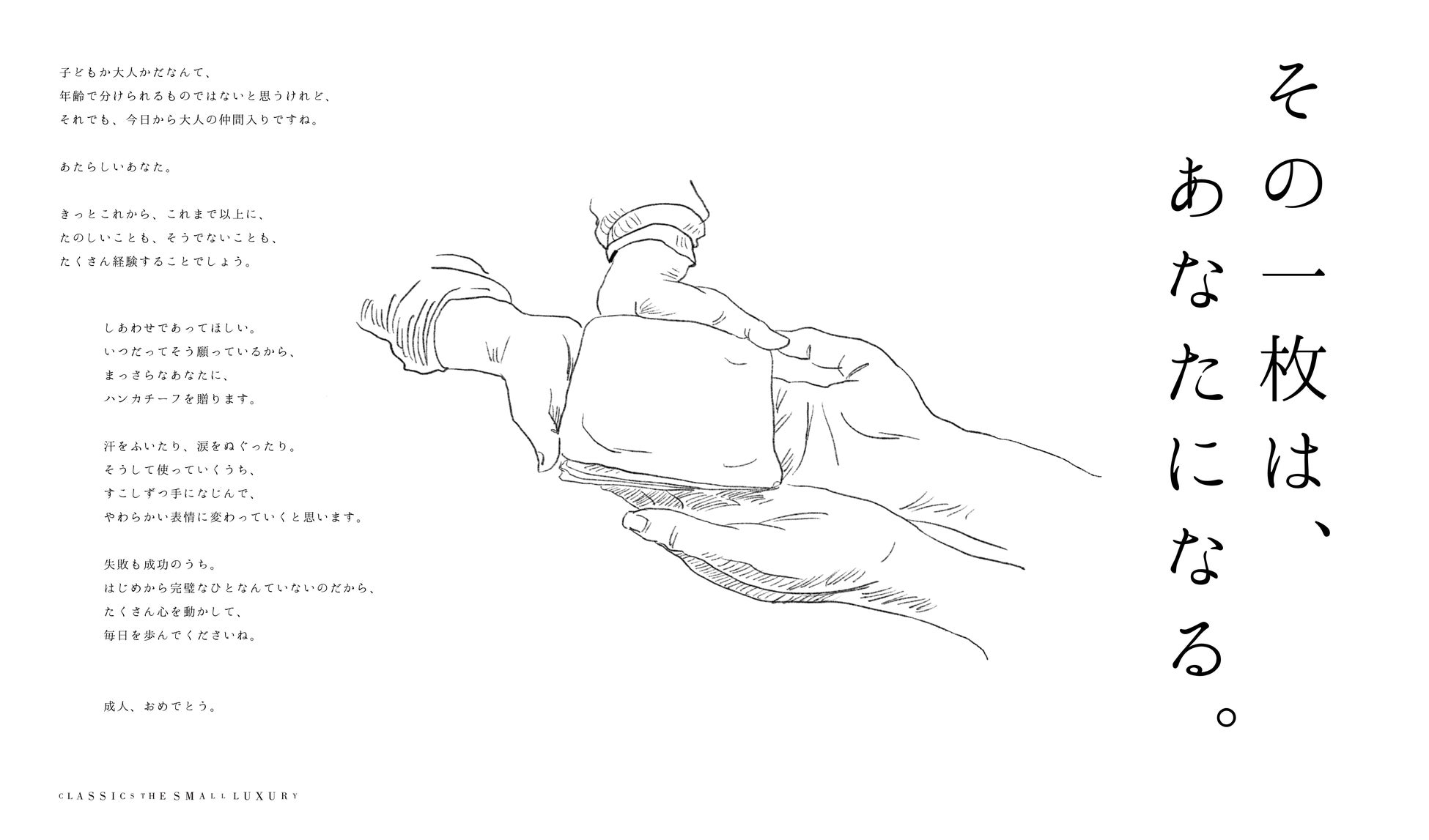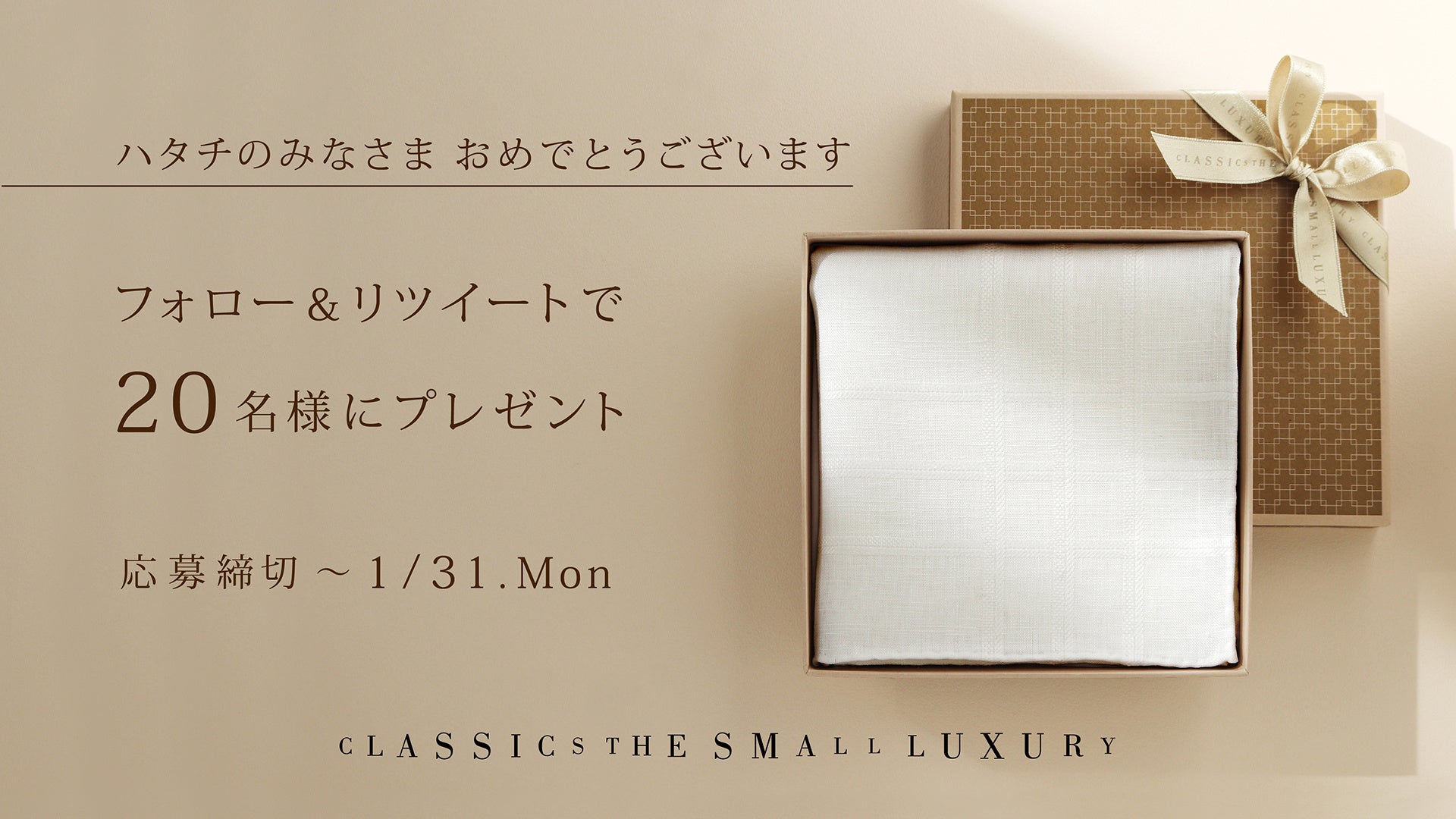 CLASSICS the Small Luxury (クラシクス・ザ・スモールラグジュアリ) は、東京、日本橋人形町を拠点に、日本のハンカチーフ業界のパイオニアである、繊維製品企画販売のブルーミング中西株式会社(本社 東京都 中央区 取締役社長 中西一) が運営する、世界で初めてのハンカチーフ専門店です。新成人を祝して、2つのキャンペーンを実施します。