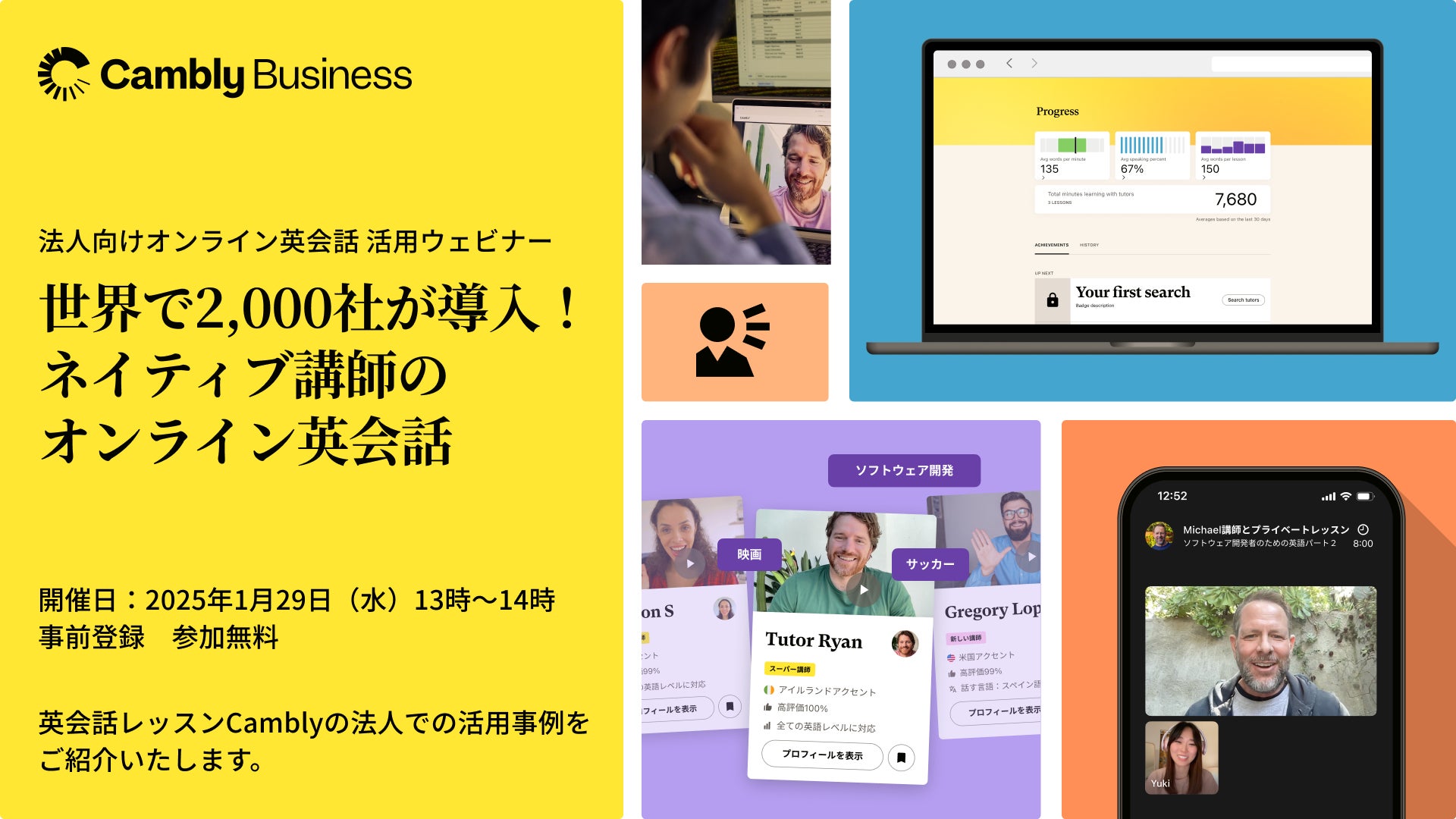 Cambly Inc.(本社:アメリカ・サンフランシスコ)は、2025年1月29日(水)に法人企業の人事・研修ご担当者を対象にしたウェビナーを開催します。本ウェビナーでは、過去の法人導入に関するアンケート結果などを交えながら、法人向けプランのご案内やオンライン英会話の活用方法をご紹介します。参加無料です。