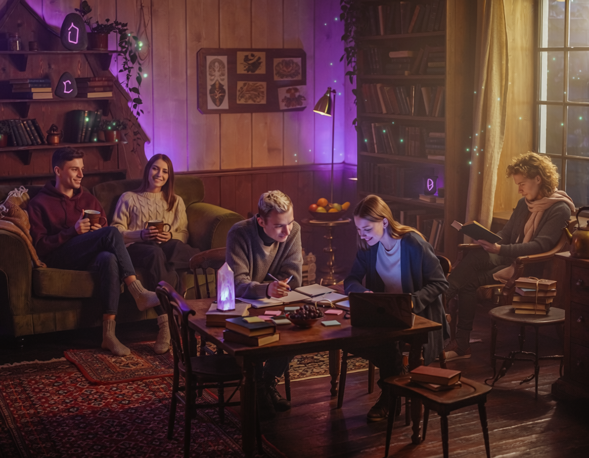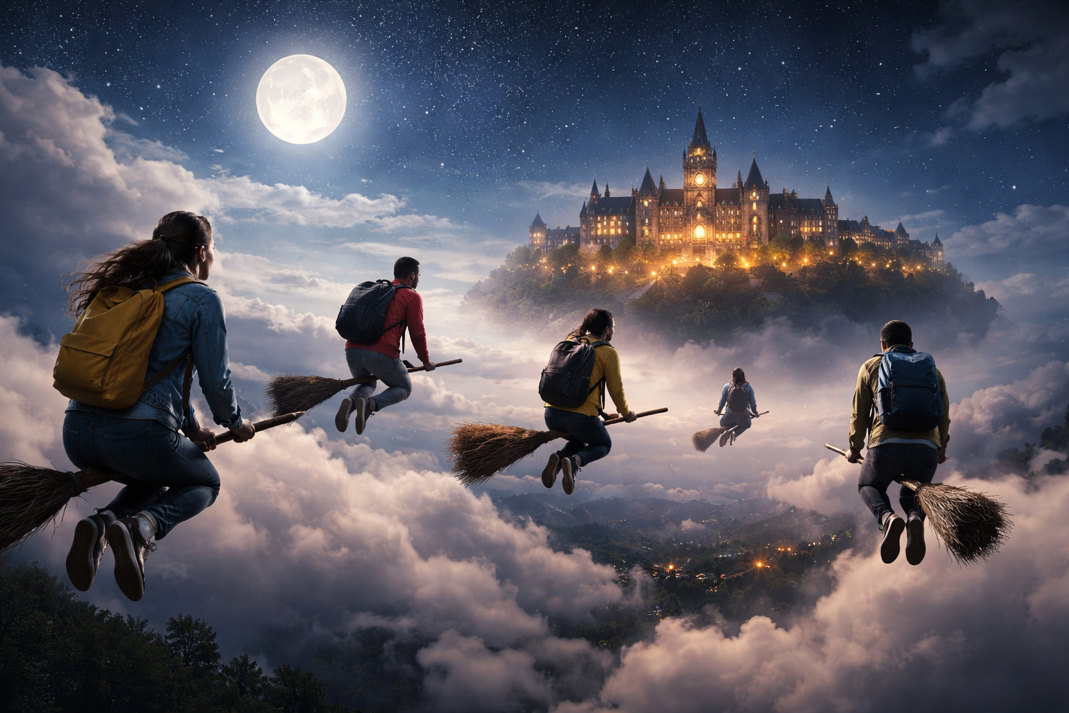 魔法都市留学では、ヨーロッパの街並みに似た落ち着いた環境の中で、日々変化する気候や状況に対応しながら学習を進めます。呪文(英語)を用いた実践授業や、魔法史・異文化理解に関する講義を通じて、多角的な視点を養うことができます。