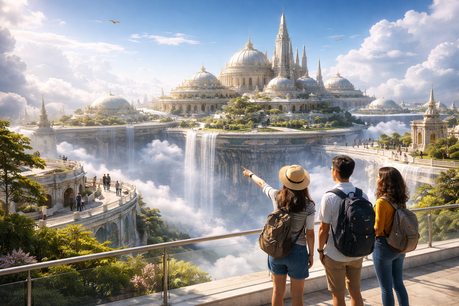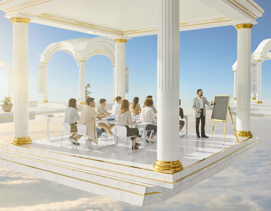 天空都市留学は、高地に近い気候と穏やかな風に包まれた環境で、のびのびと学習できるプログラムです。白とゴールドを基調とした浮遊型キャンパスでは、実践的な英語トレーニングや多国籍の学生との交流を通じて、グローバルな視野を養います。