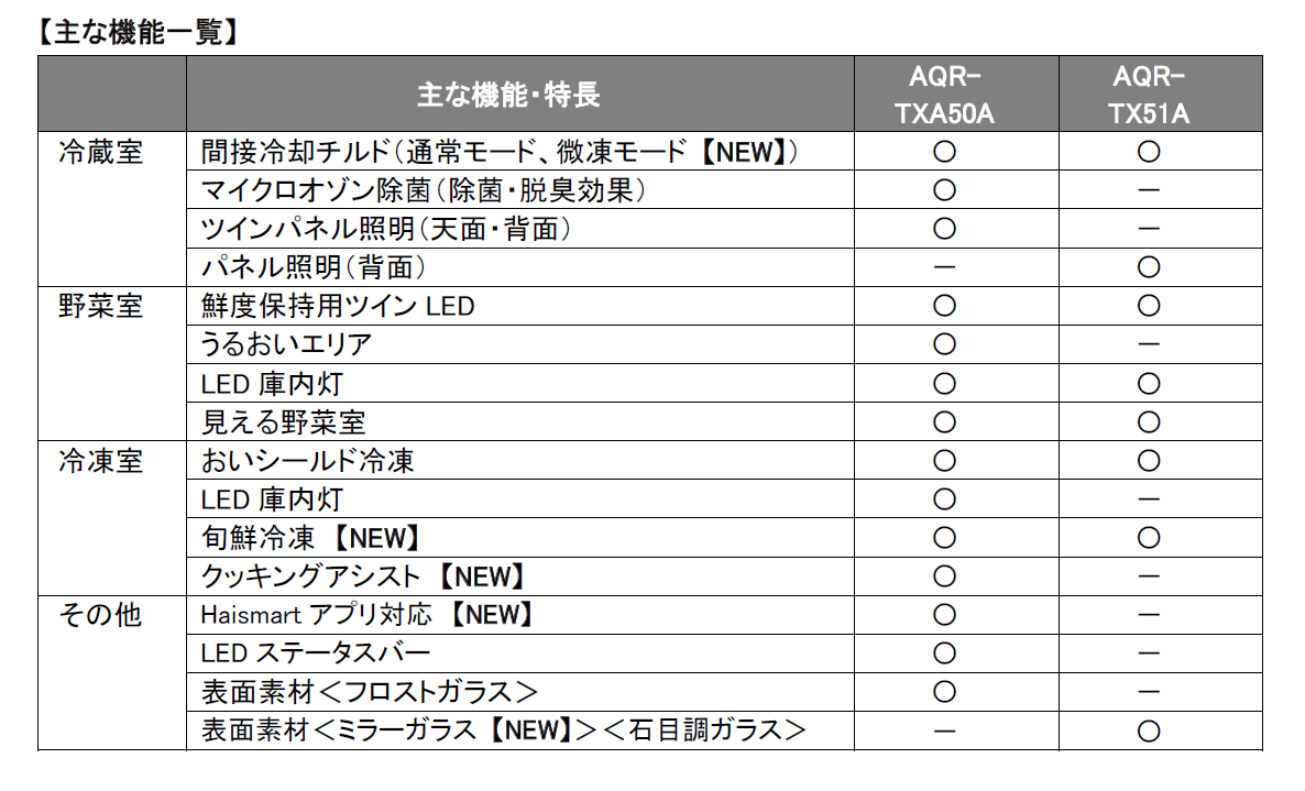 2025年モデルに引き続き、「AQR-TXA50A」には特別な加工を施し指紋が付きにくい上質な「フロストガラス」を表面素材に採用。「AQR-TX51A」は個性的な「石目調ガラス」と、新色を取り入れたスタイリッシュな「ミラーガラス」素材で展開します。