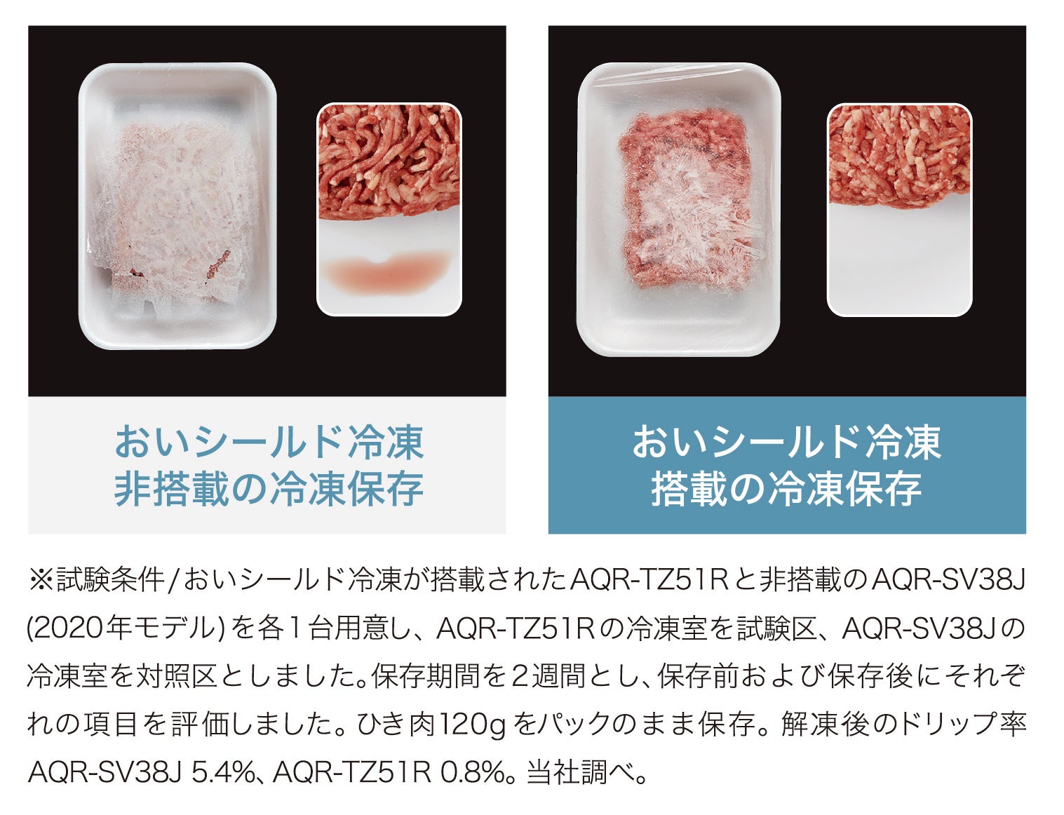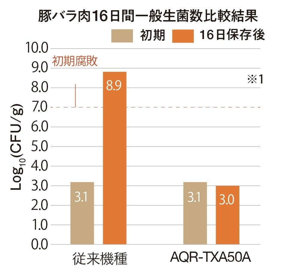 ※1:試験条件/AQR-TXA50AとAQR-SV38K(2021年モデル)を各1台用意し、AQR-TXA50Aのチルドルーム(微凍モード)を試験区、AQR-SV38Kのチルドルームを対照区としました。保存期間を16日間とし、保存前および保存後にそれぞれの項目を評価しました。豚バラ肉を購入し、パックのまま保存。一般生菌数: 初期菌数1.3×103(CFU/g)、 保存後 AQR-SV38K 7.8×108(CFU/g)、AQR-TXA50A 1.0×103(CFU/g)。 (一財)日本食品分析センター調べ(成績書番号:第23021241007-0101号、第23021241008-0101号、第23021241009-0101号)。