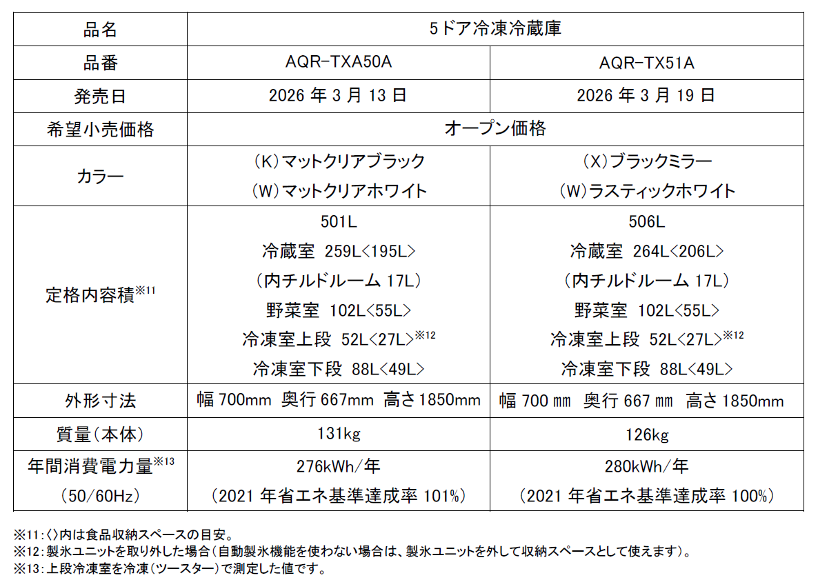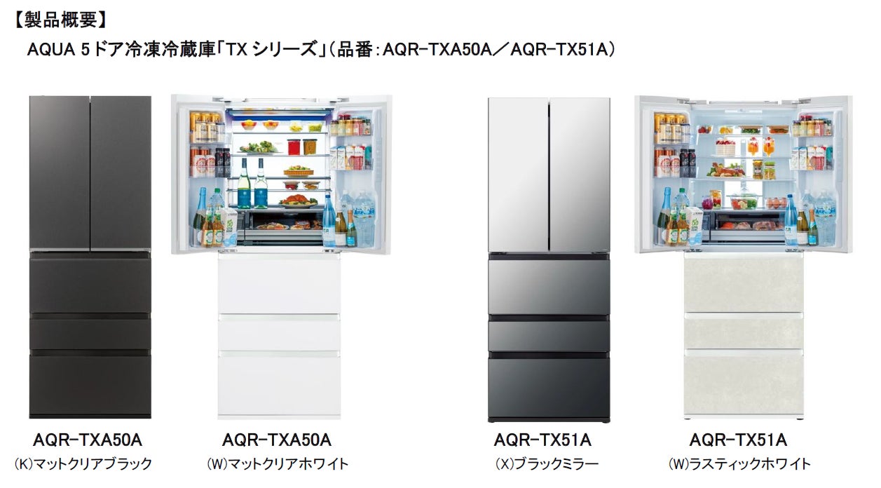 アクア株式会社(本社:東京都中央区、代表取締役社長 兼 CEO:杜 鏡国)は、AQUA冷凍冷蔵庫のフラッグシップモデル「TXシリーズ」の最新機種(品番:AQR-TXA50A、AQR-TX51A)を、2026年3月13日(金)より順次発売いたします。