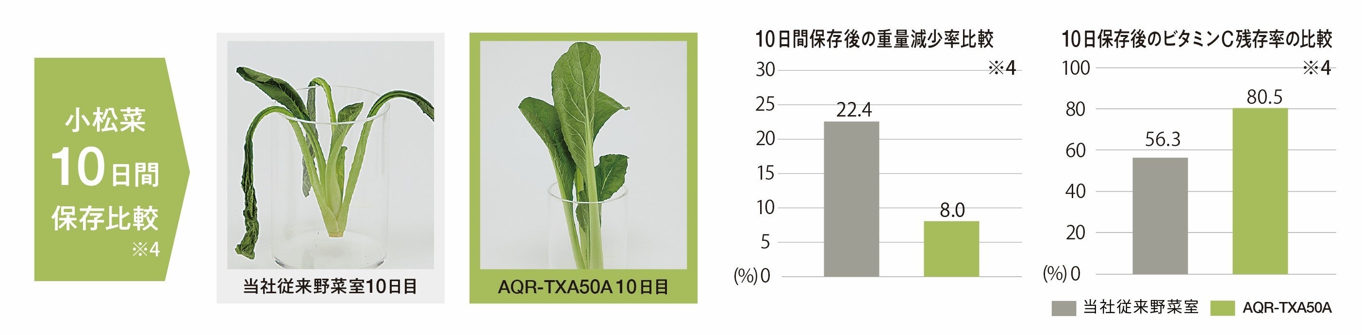 ※4:試験条件/AQR-TXA50AとAQR-SV38K(2021年モデル)を各1台用意し、AQR-TXA50Aの野菜室(うるおいエリア)を試験区、AQR-SV38Kの野菜室を対照区として約1.8㎏の野菜をラップなし、ドア開閉なし、ツインLEDオフで保存しました。保存期間を10日間とし、保存前および保存後にそれぞれの項目を評価しました。小松菜の保存後の重量減少率はAQR-SV38K 22.4%、AQR-TXA50A 8.0%。保存後のビタミンC 残存率AQR-SV38K 56.3%、AQR-TXA50A 80.5%。運転状況や食品の種類、状態や量により、効果は異なります。当社調べ。