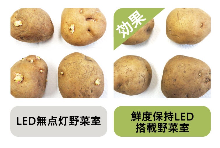 ※6:試験条件/AQR-TXA50A(鮮度保持LEDを野菜室に搭載)と常温を想定したフィールド試験室(15~30℃)に設置し、1台では鮮度保持LED照射有り、もう 1 台では鮮度保持LED照射無しとして運転(冷蔵室の設定:中、冷凍室の設定:中)。野菜室のバスケットにじゃがいもを28日間保存した後の外観を評価しました。当社調べ。