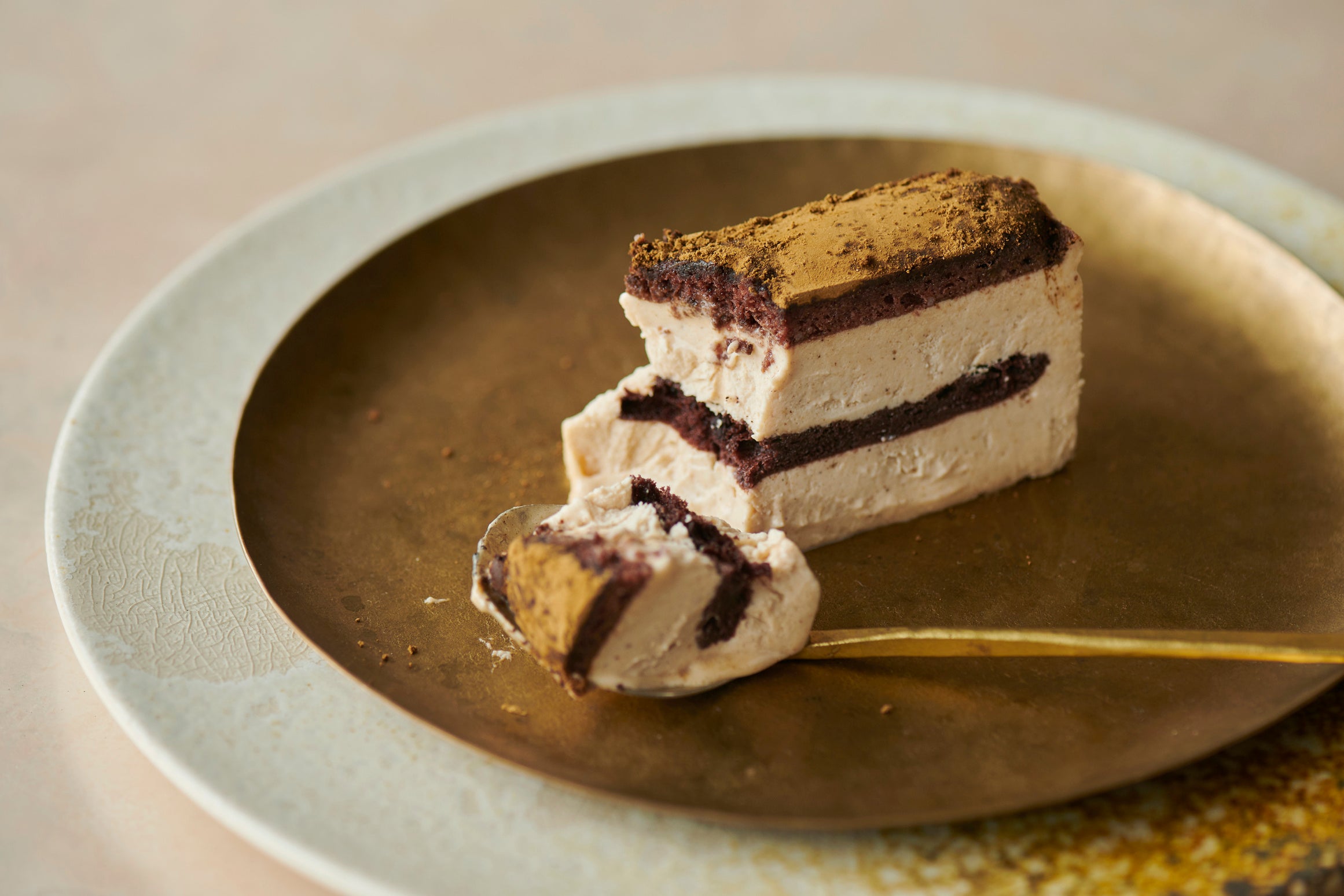 イタリアンメレンゲを使用しているリッチティラミスは、チーズケーキよりも軽やかで淡い口溶けなので、より香りを感じやすくなっています。そのため、シナモンの甘さやカルダモンの爽やかさ、クローブの香ばしさがバランス良く組み合わさって生み出される、重層的な味わいと心地よく続く香りの余韻を、より印象的に楽しんでいただけると思います。