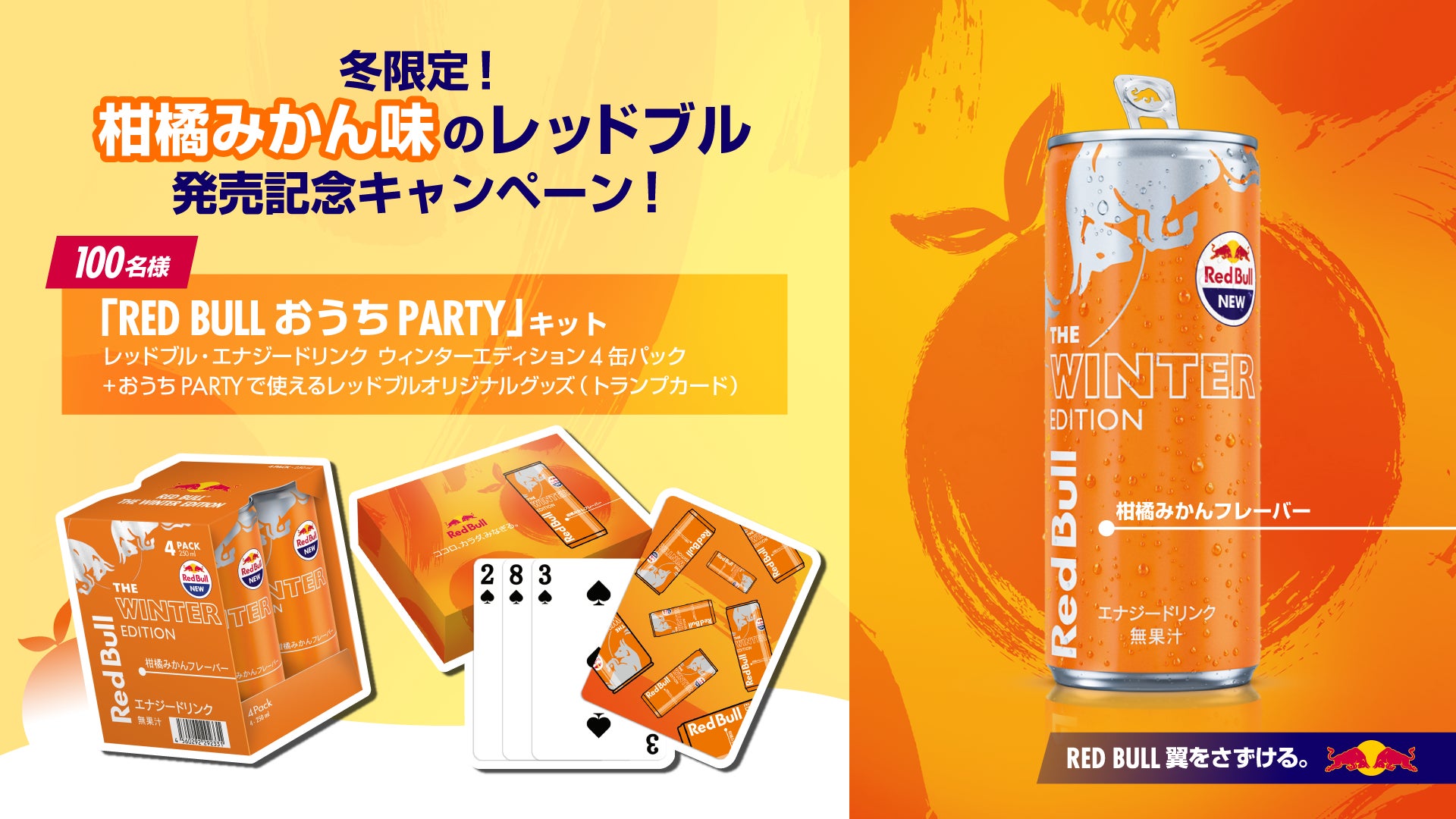 本商品は、みかんをメインに、他の柑橘風味を加えることで甘味と酸味のバランスが取れた、冬にぴったりの味わいです。また、クリスマスパーティーや忘年会など、友人との”宅飲み”が増えるこれからの時期にぴったりな、レッドブルおうちPARTYキットが当たるキャンペーンも実施いたします。ぜひ奮ってご応募ください!