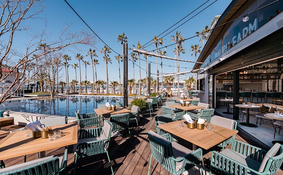 『マリブファーム 逗子マリーナ』では、現地の人気メニューの他、地元湘南の新鮮野菜や相模湾の魚介類を使用した日本限定メニューもご用意しています。全開可能なサッシによりテラス席と内部が一体となる設えで、約50席の屋内席の他、マリーナの海から繋がるような大きな水盤が広がる約80席のテラスには、三方を水に包まれたウォーターテラス席や、暖炉を囲むファイヤーテラス席などシチュエーションに応じてお使いいただけます。豊富なテラス席を有するため、ペット同伴でのお食事に最適なレストランです。