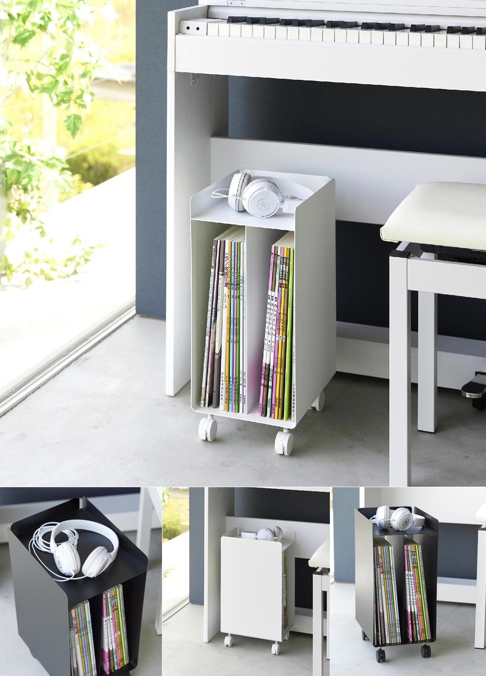 ピアノの楽譜をスッキリまとめて足元に置けるキャスター付きのコンパクトなミニワゴン。