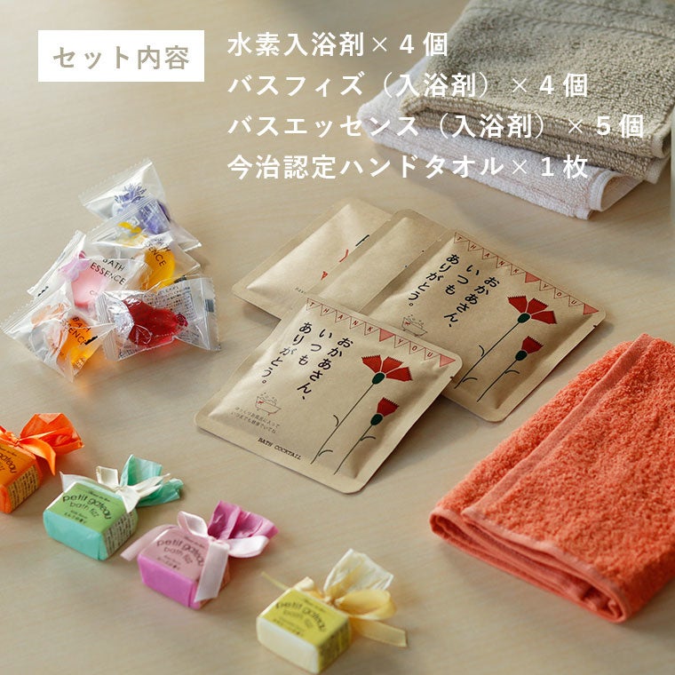 ■内容:水素入浴剤4個、バスフィズ4個、バスエッセンス5個、今治ハンドタオル1枚
