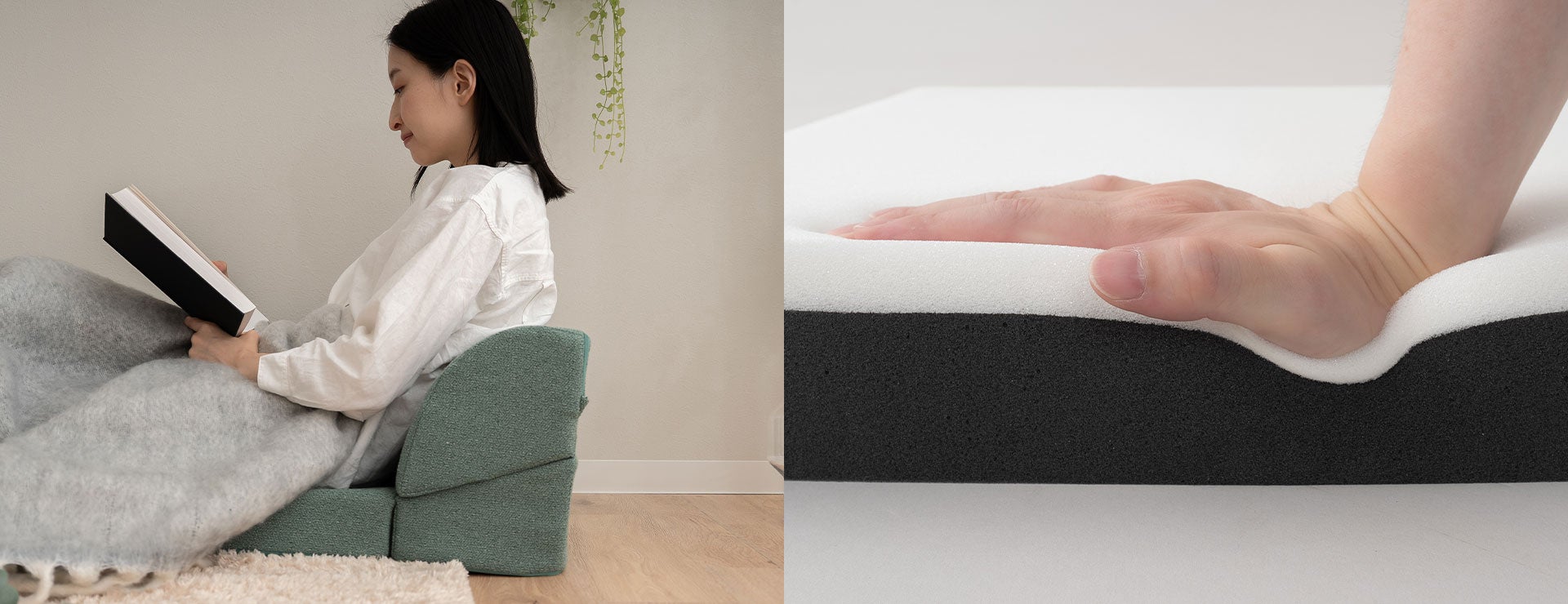 そのすべてを叶える高品質ウレタンと、8cm厚のマットレス基準設計のフロアソファ。ソファの快適さとベッドの心地よさを兼ね備えた「すぐに寝れるフロアソファ」で、あなたの“おうち時間”を格上げしませんか?