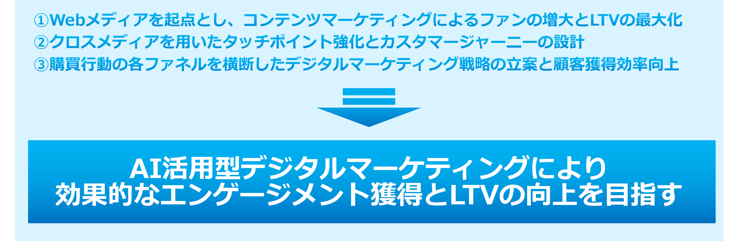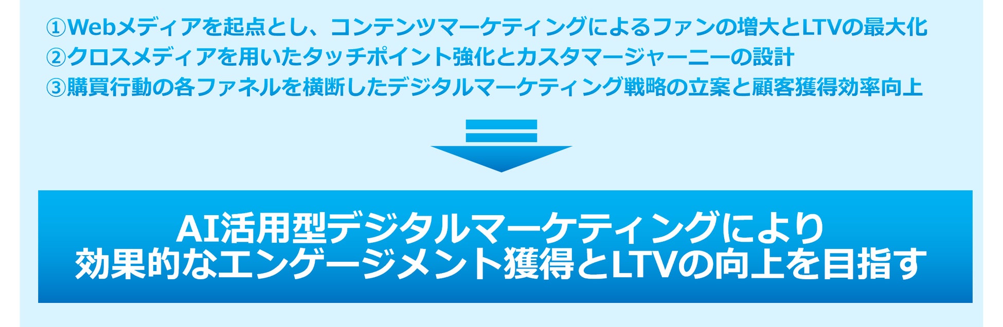 同社はデジタルマーケティング領域において、AIとデータを駆使し、認知獲得から購買後のLTV最大化まで、消費行動のすべてのプロセスをワンストップで支援するトータルソリューションを展開しています。同社グループは、コンテンツマーケティング、SEO、SNS運用など、それぞれのドメインにおいて高い専門性を有する組織・人材で構成されており、グループ横断のAI活用基盤と有機的なグループシナジーの発揮により、マーケティング全体を通した効果的な戦略設計と高速なマネジメントサイクルの実施を可能としています。また、100以上にのぼる自社メディアや多様なコンテンツといった豊富なアセットを背景に、AIによる解析を通じ、製品や目的に応じた最適なターゲティングと施策実行を行うことで、再現性の高いデジタルマーケティングを実現しています。