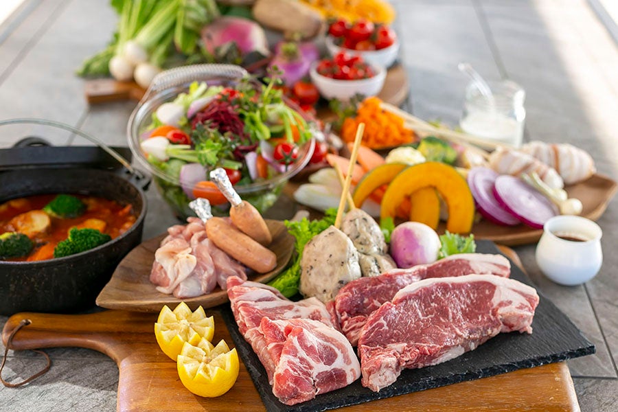 ②自家農園の新鮮野菜と地元食材を焼き上げるBBQディナー