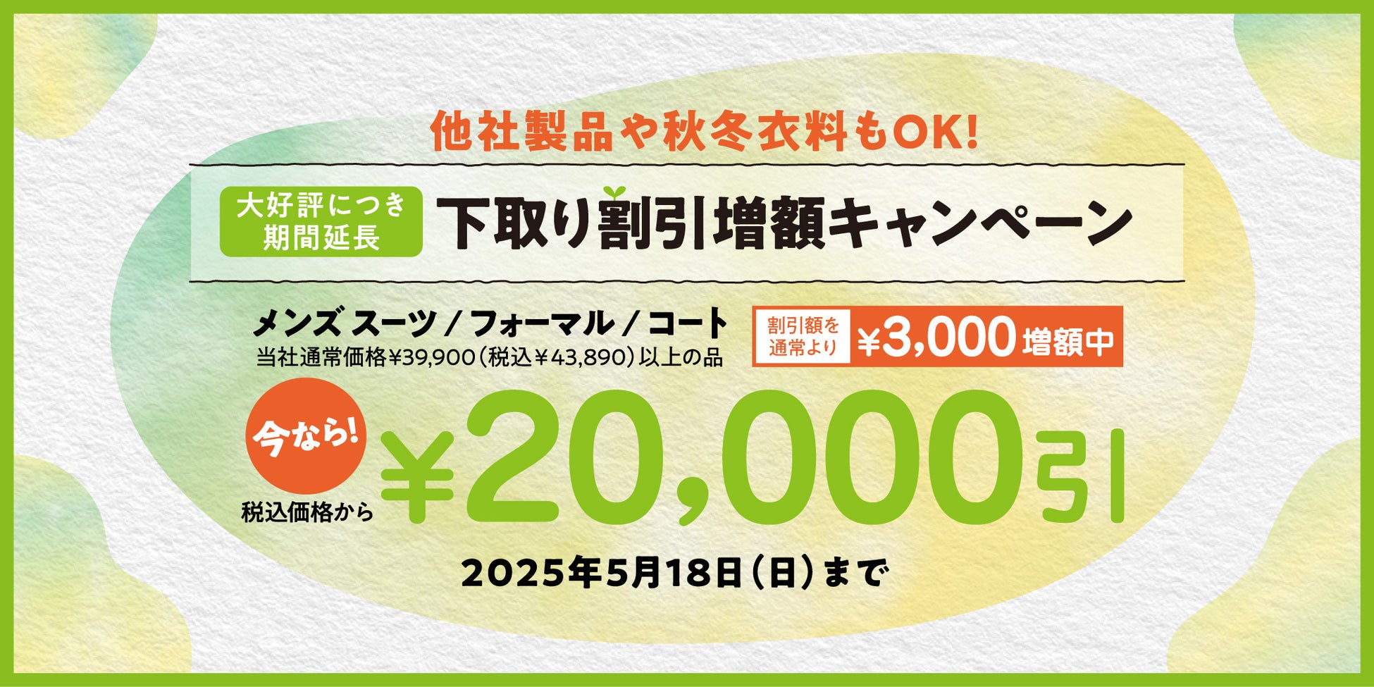 キャンペーン内容:メンズのスーツ、フォーマル、コートをお持ちいただくと、43,890円(税込)以上のメンズスーツまたはフォーマルが割引になる下取り割引券を進呈しています。