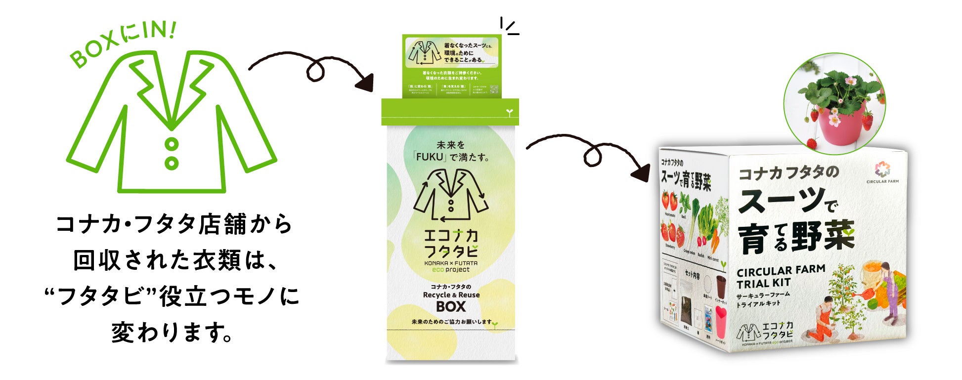 この度、「エコナカ フタタビ」プロジェクト第3弾として衣類から再資源化された土壌改良材を用いた「コナカ・フタタのスーツで育てる野菜」シリーズをスタートします。初回は、「いちご栽培キット」をご用意し、コナカ・フタタで実施中の「下取り割引増額キャンペーン」をご利用いただいたお客様に先着順でプレゼントさせていただくキャンペーンを実施します。
