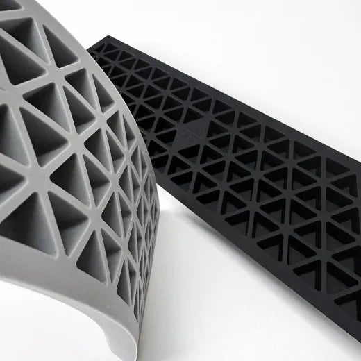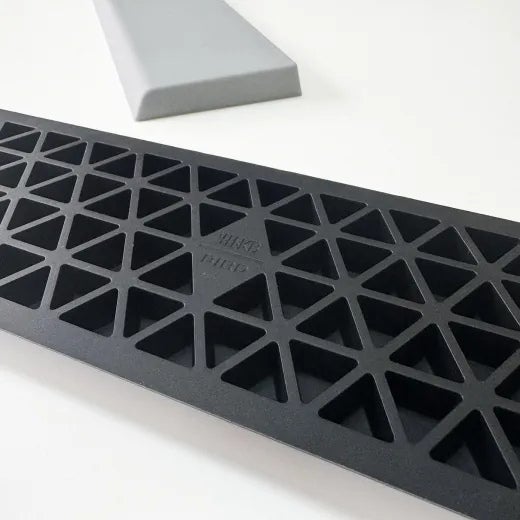 設置面には日本の伝統文様「うろこ格子(鱗格子)」を採用。幾何学的に配置された鱗の形は、デザインとしての美しさに加え、ストッパーとしての機能性も兼ね備えています。さらに、格子状にすることでシリコン全体に適度な柔軟性が生まれ、天板のわずかな歪みにも自然にフィット。安定性と心地よさの両立を実現しています。 -