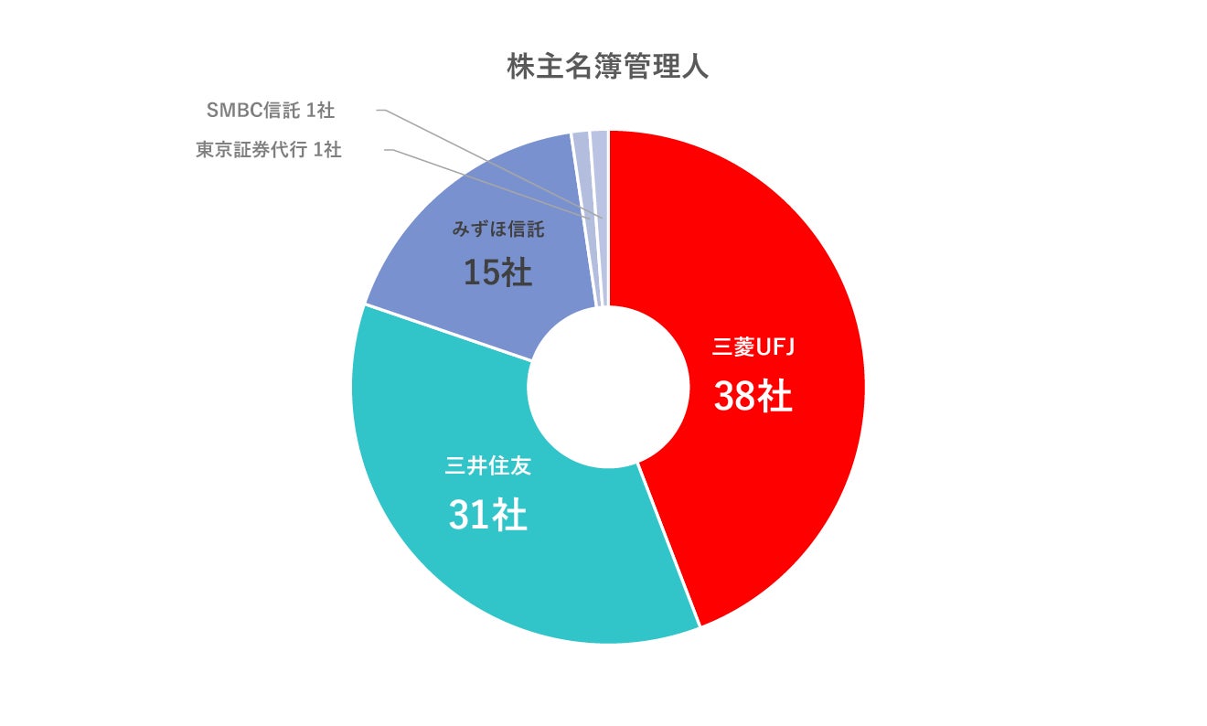 三菱UFJ信託銀行が38社・44.1%(前年比8.0%減)、三井住友信託銀行が31社・36.0%(前年比2.0%減)、その他17社となりました。