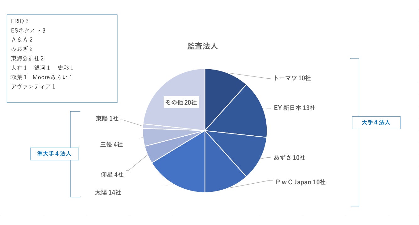 大手4社(トーマツ、EY新日本、あずさ、PwC Japan)のシェアは50.0%、準大手5社(太陽、仰星、三優、東陽)のシェアは26.7%、大手・準大手合わせたシェアは76.7%となりました。
