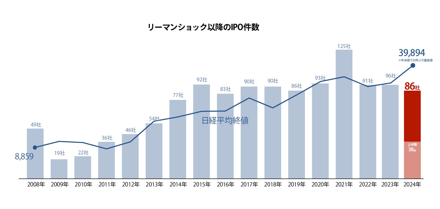2024年の国内IPO企業数は86社で、近年の水準を維持した着地となりました。