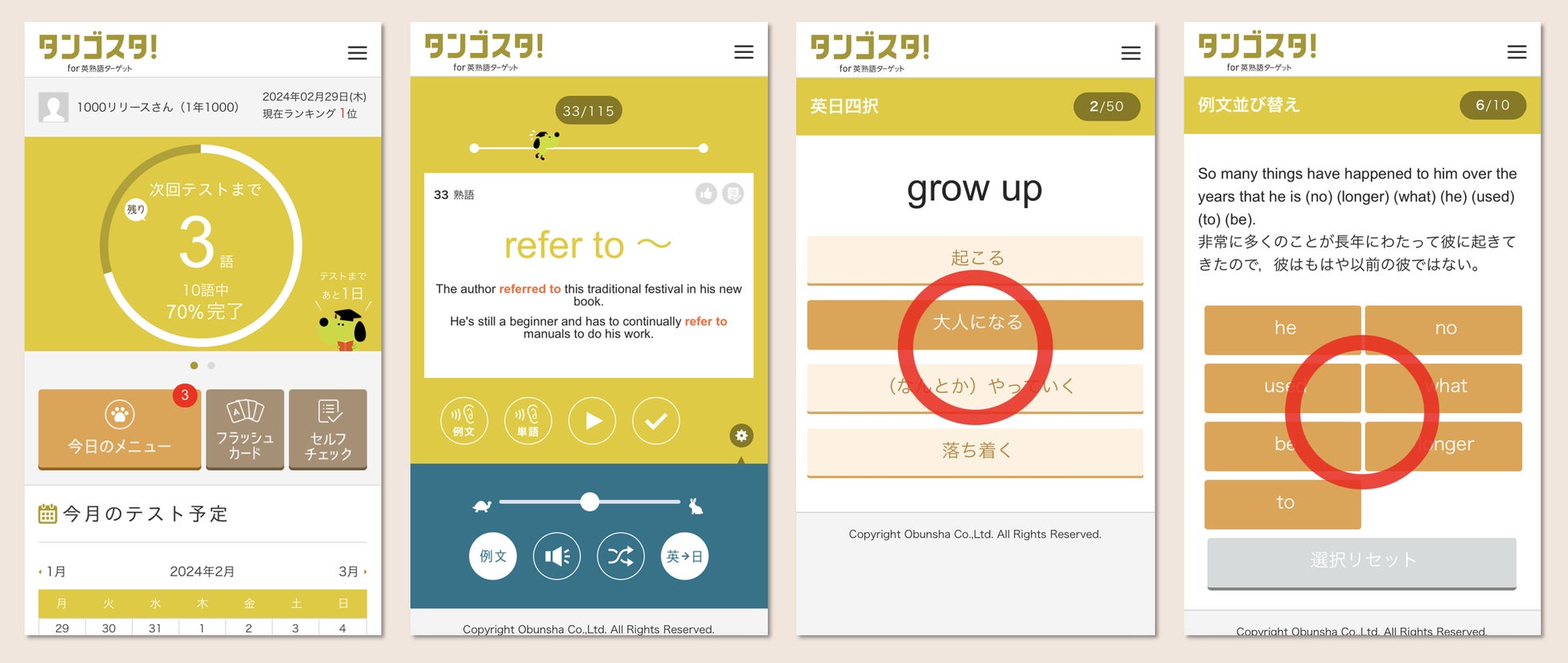 これまで旺文社刊行の英単語集「英単語ターゲット」・「英検® でる順パス単」シリーズのコンテンツに対応し、単語力の向上をサポートしてきましたが、今回要望の多かった『英熟語ターゲット1000 5訂版』に対応したことで、「タンゴスタ!」を英熟語や英語構文の学習にもご利用いただけるようになりました。